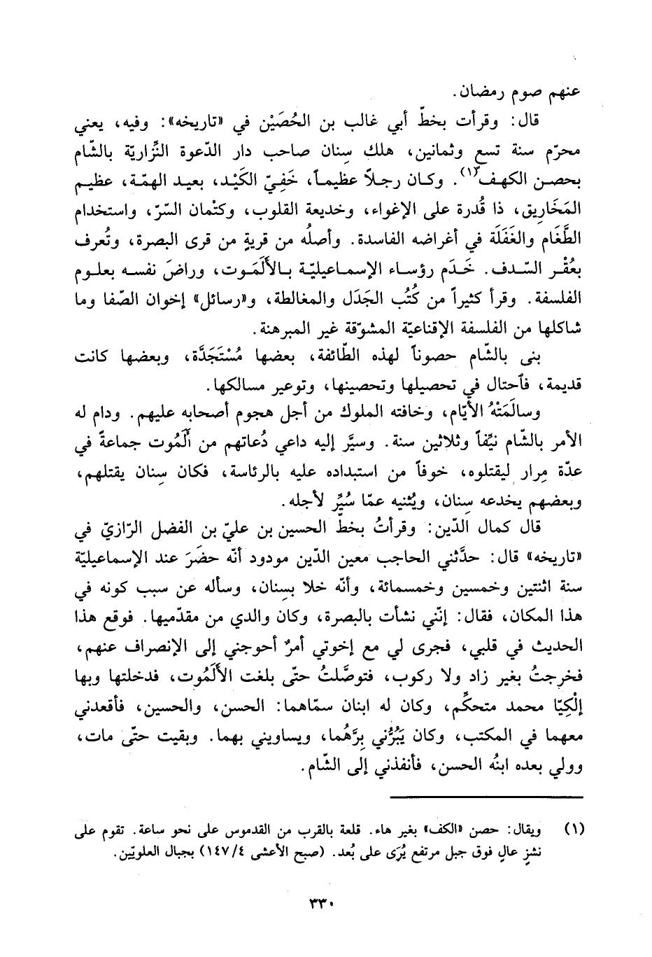 قَالَ: وقرأت بخطّ أَبِي غالب بْن الحُصَيْن فِي «تاريخه» : وفيه، يعني محرّم سنة تسع وثمانين، هلك سِنان صاحب دار الدّعوة النِّزاريَّة بالشّام بحصن الكهف [1] . وكان رَجُلًا عظيما، خَفِيّ الكّيْد، بعيد الهمّة، عظيم المخاريق، ذا قُدرة عَلَى الإغواء، وخديعة القلوب، وكتْمان السّرّ، واستخدام الطَّغَام والغَفَلَة فِي أغراضه الفاسدة. وأصلُه من قريةٍ من قرى البصرة، وتُعرف بعُقْر السّدف. خَدَم رؤساء الإسماعيليّة بالأَلَمَوت، وراضَ نفسه بعلوم الفلسفة. وقرأ كثيرا من كُتُب الجدل والمغالطة، و «رسائل» إخوان الصّفا وما شاكلها منَ الفلسفة الإقناعيّة المشوّقة غير المبرهنة.