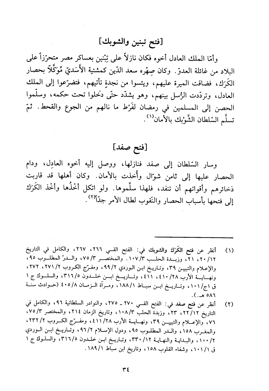 [1] انظر عن فتح الكرك والشوبك في: الفتح القسي 266، 267، والكامل في التاريخ 12/ 20، 21، وزبدة الحلب 3/ 107. والمختصر 3/ 75، والدرّ المطلوب 95، والإعلام والتبيين 39، وتاريخ ابن الوردي 2/ 99، ومفرّج الكروب 2/ 271، 272، ونهاية الأرب 28/ 410، 411، وتاريخ ابن خلدون 5/ 316، والسلوك ج 1 ق 1 ج/ 101، وتاريخ ابن سباط 1/ 188، ومرآة الزمان 8/ 405 (حوادث سنة 586 هـ.) .