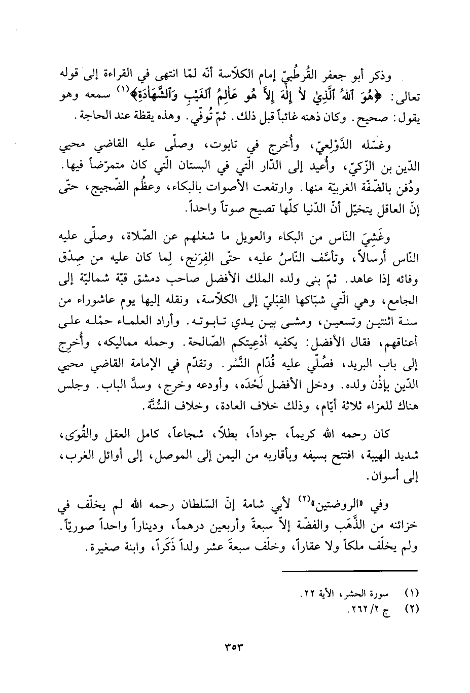 وَفِي «الروضتين» [2] لأبي شامة إنّ السّلطان رحِمَه اللَّه لَمْ يخلّف فِي خزائنه منَ الذَّهَب والفضّة إلّا سبعة وأربعين درهما، ودينارا واحدا صوريّا.
