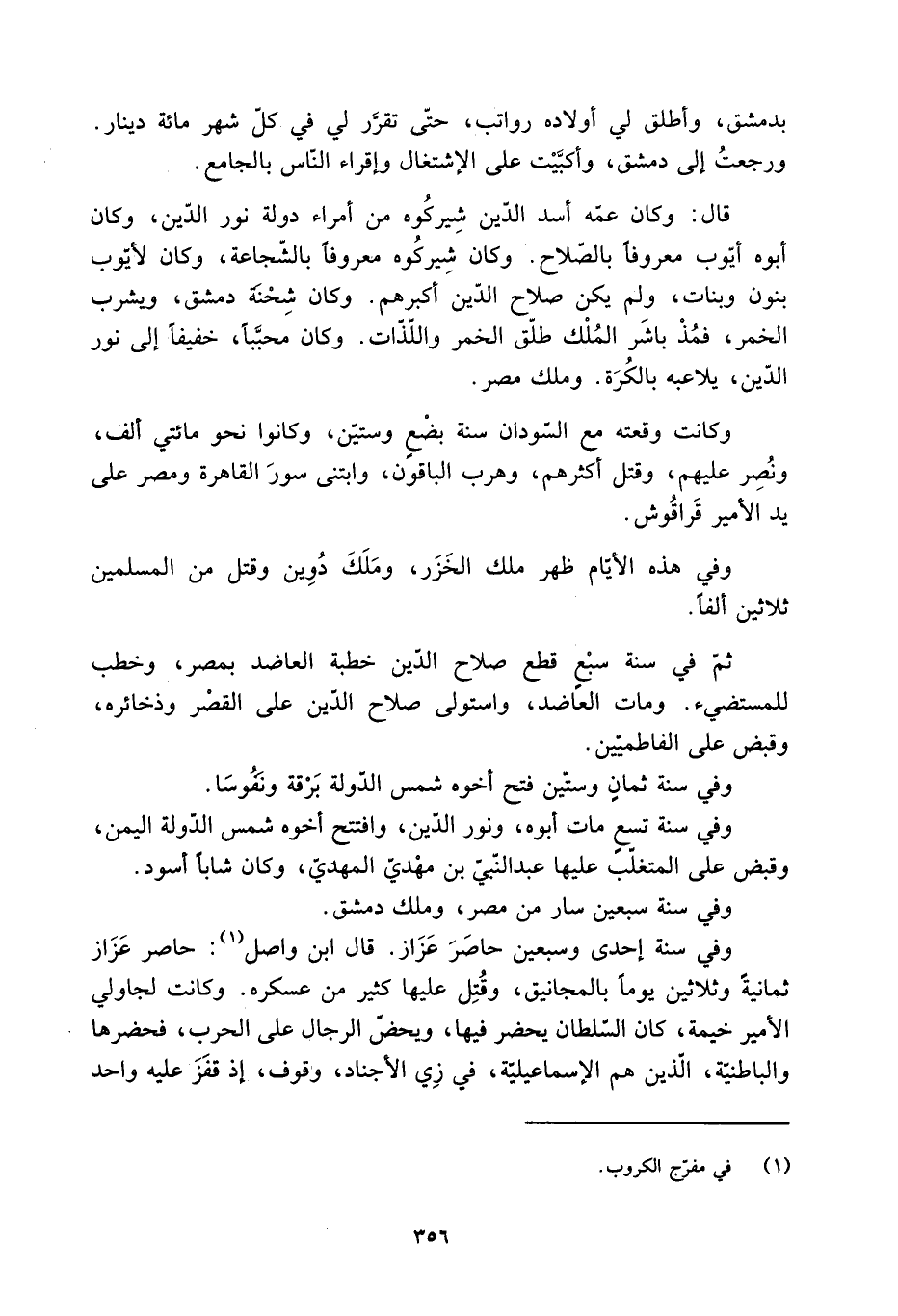 قَالَ: وكان عمّه أسد الدّين شِيركُوه من أمراء دولة نور الدّين، وكان أَبُوهُ أيّوب معروفا بالصّلاح. وكان شيركوه معروفا بالشّجاعة، وكان لأيّوب بنون وبنات، ولم يكن صلاح الدّين أكبرهم. وكان شِحْنَة دمشق، ويشرب الخمر، فمُذْ باشَر المُلْك طلّق الخمر واللّذّات. وكان محبَّبًا، خفيفا إِلَى نور الدّين، يلاعبه بالكُرَة. وملك مصر.