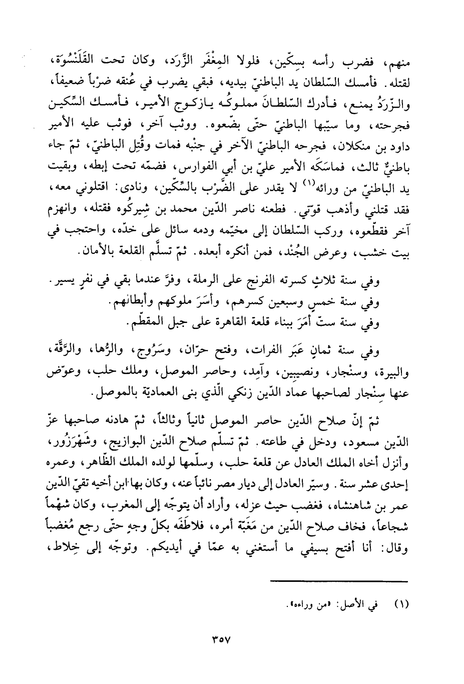 منهم، فضرب رأسه بسِكين، فلولا المِغْفَر الزَّرَد، وكان تحت القَلَنْسُوَة، لقتله. فأمسك السّلطان يد الباطنيّ بيديه، فبقي يضرب فِي عُنقه ضرْبًا ضعيفا، والزّرَدُ يمنع، فأدرك السّلطان مملوكُه يازكوج الأمير، فأمسك السِّكين فجرحته، وما سيّبها الباطنيّ حَتَّى بضّعوه. ووثب آخر، فوثب عليه الأمير دَاوُد بْن منكلان، فجرحه الباطنيّ الآخر فِي جنْبه فمات وَقُتِلَ الباطنيّ، ثُمّ جاء باطنيٌّ ثالث، فماسَكَه الأمير عَلِيّ بْن أَبِي الفوارس، فضمّه تحت إبطه، وبقيت يد الباطنيّ من ورائه [1] لا يقدر عَلَى الضَّرْب بالسِّكين، ونادى: اقتلوني معه، فقد قتلني وأذهب قوّتي. فطعنه ناصر الدّين مُحَمَّد بْن شِيركُوه فقتله، وانهزم آخر فقطّعوه، وركب السّلطان إِلَى مخيّمه ودمه سائل عَلَى خدّه، واحتجب فِي بيت خشب، وعرض الْجُنْد، فَمنْ أنكره أبعده. ثُمّ تسلَّم القلعة بالأمان.