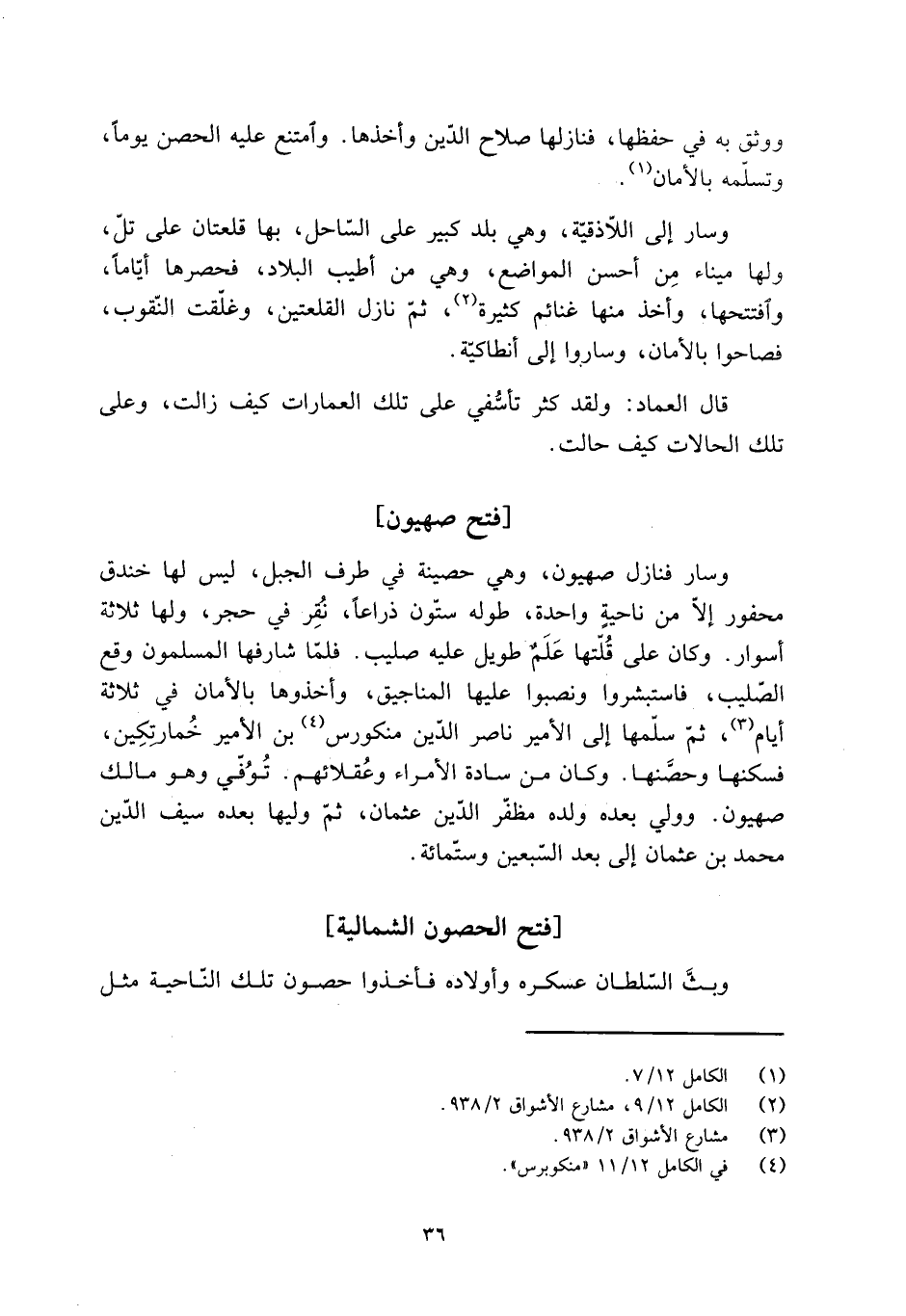 وسار فنازل صهيون، وهي حصينة فِي طرف الجبل، لَيْسَ لها خندق محفور إلّا من ناحية واحدة، طوله ستّون ذراعا، نُقِر فِي حجر، ولها ثلاثة أسوار. وكان عَلَى قُلتها عَلَمٌ طويل عليه صليب. فَلَمَّا شارفها المسلمون وقع الصّليب، فاستبشروا ونصبوا عليها المناجيق، وأخذوها بالأمان فِي ثلاثة أيّام [3] ، ثُمَّ سلّمها إلى الأمير ناصر الدّين منكورس [4] بْن الأمير خُمارتِكِين، فسكنها وحصَّنها. وكان من سادة الأمراء وعُقلائهم. تُوُفّي وَهُوَ مالك صهيون. وولي بعده ولده مظفّر الدّين عُثْمَان، ثمّ وليها بعده سيف الدّين مُحَمَّد بْن عثمان إلى بعد السّبعين وستّمائة.