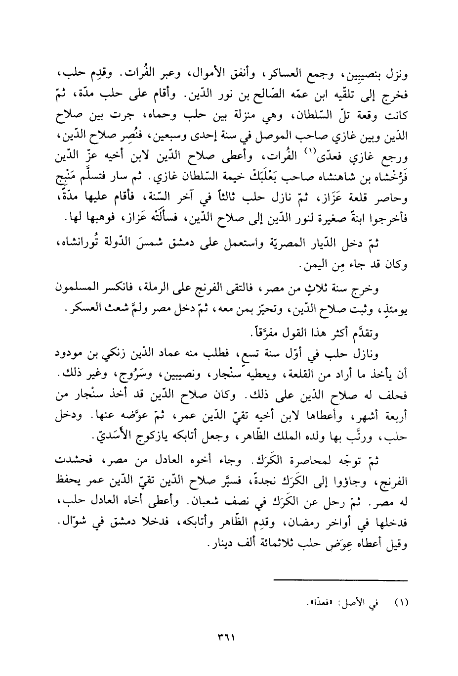 ونزل بنصيبين، وجمع العساكر، وأنفق الأموال، وعبر الفُرات. وقدِم حلب، فخرج إلى تلقّيه ابن عمّه الصّالح بْن نور الدّين. وأقام عَلَى حلب مدّة، ثُمّ كَانَتْ وقعة تلّ السّلطان، وهي منزلة بَيْنَ حلب وحماه، جرت بَيْنَ صلاح الدّين وبَيْنَ غازي صاحب المَوْصِل فِي سنة إحدى وسبعين، فنُصِر صلاح الدّين، ورجع غازي فعدّى [1] الفُرات، وأعطى صلاح الدّين لابن أخيه عزّ الدّين فرّخ شاه بْن شاهنشاه صاحب بِعْلَبَكّ خيمة السّلطان غازي. ثُمّ سار فتسلَّم مَنْبِج وحاصر قلعة عزاز، ثُمّ نازل حلب ثالثا فِي آخر السّنة، فأقام عليها مدّة، فأخرجوا ابنة صغيرة لنور الدّين إِلَى صلاح الدّين، فسأَلَتْه عَزاز، فوهبها لها.