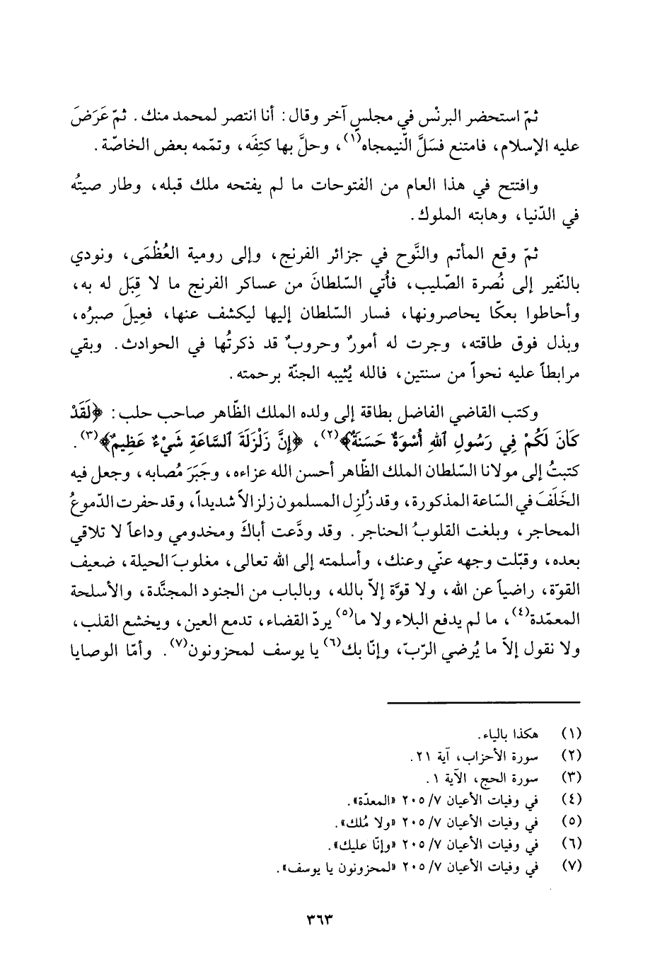 كتبتُ إِلَى مولانا السّلطان الملك الظّاهر أحسن اللَّه عزاءه، وجَبَرَ مُصابه، وَجَعَل فِيهِ الخَلَفَ فِي السّاعة المذكورة، وَقَدْ زُلزِل المسلمون زلزالا شديدا، وَقَدْ حفرت الدموعُ المحاجر، وبلغت القلوبُ الحناجر. وَقَدْ ودَّعت أباكَ ومخدومي وداعا لا تلاقي بعده، وقبّلت وجهه عنّي وعنك، وأسلمته إِلَى اللَّه تَعَالَى، مغلوبَ الحيلة، ضعيف القوّة، راضيا عَنِ اللَّه، ولا قوَّة إلّا باللَّه، وبالباب مِنَ الجنود المجنَّدة، والأسلحة المعمّدة [4] ، ما لَمْ يدفع البلاء ولا ما [5] يردّ القضاء، تدمع العين، ويخشع الْقَلْبُ، وَلَا نَقُولُ إِلَّا مَا يُرضِي الرَّبَّ، وإنّا بك [6] يا يوسف لمحزونون [7] . وأمّا الوصايا