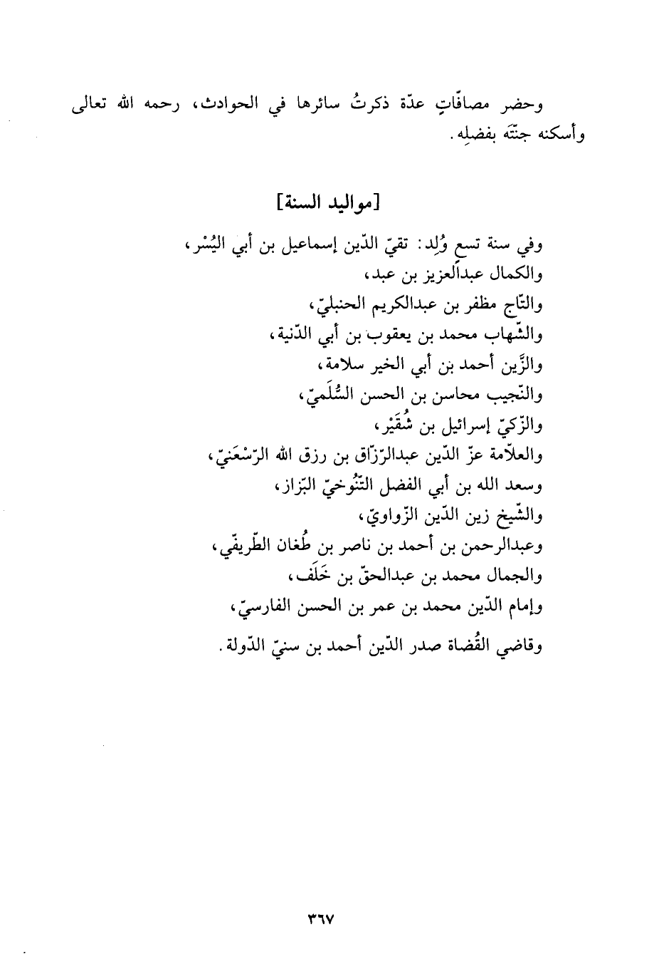 [مواليد السنة] وَفِي سنة تسعٍ وُلِد: تقيّ الدّين إِسْمَاعِيل بْن أَبِي اليُسْر، والكمال عَبْد الْعَزِيز بْن عَبْد، والتّاج مظفَّر بْن عَبْد الكريم الحنبليّ، والشّهاب مُحَمَّد بْن يعقوب بْن أَبِي الدّنية، والزّين أحمد بْن أَبِي الخير سلامة، والنّجيب محاسن بْن الْحَسَن السُّلَميّ، والزّكيّ إِسْرَائِيل بْن شُقَيْر، والعلّامة عزّ الدِّين عَبْد الرّزّاق بْن رزق اللَّه الرّسْعَنيّ، وسعد اللَّه بْن أَبِي الفضل التّنُوخيّ البزّاز، والشّيخ زين الدّين الزّواويّ، وعبد الرَّحْمَن بْن أَحْمَد بْن ناصر بْن طُغان الطّريفيّ، والجمال مُحَمَّد بْن عَبْد الحقّ بْن خَلَف، وإمام الدّين مُحَمَّد بْن عُمَر بْن الْحَسَن الفارسيّ، وقاضي القُضاة صدر الدّين أَحْمَد بْن سنيّ الدّولة.