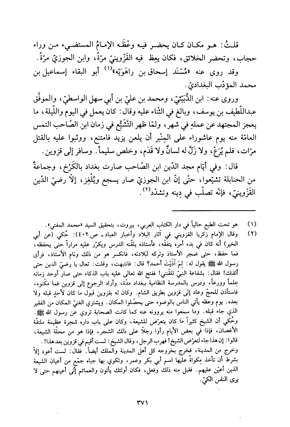 قَالَ: وَفِي أيّام مجد الدّين ابن الصّاحب صارت بغداد بالكَرْخ، وجماعةُ منَ الحنابلة تشيّعوا، حَتَّى إنّ ابن الجوزيّ صار يسجع ويُلْغِز، إلّا رَضِيَ الدّين القَزْوينيّ، فَإنَّهُ تصلّب فِي دِينه وتشدّد [2] .