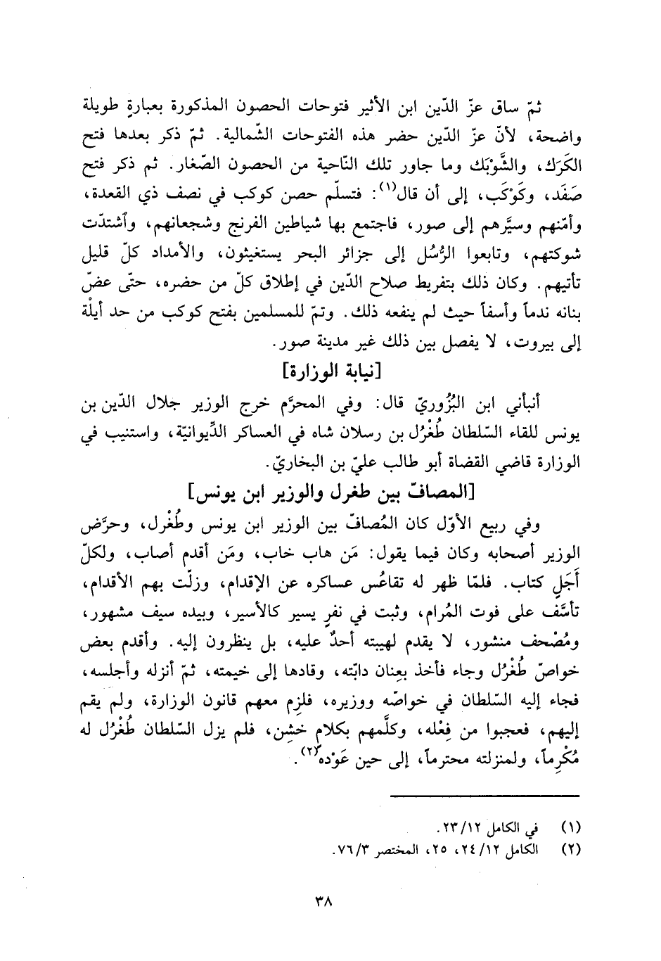 وَفِي ربيع الأوّل كان المصافّ بين الوزير ابن يُونُس وطُغْرل، وحرَّض الوزير أصحابه وكان فيما يَقُولُ: مَن هاب خاب، ومَن أقدم أصاب، ولكلّ أَجَلٍ كتاب. فَلَمَّا ظهر لَهُ تقاعُس عساكره عَنِ الإقدام، وزلّت بهم الأقدام، تأسَّف عَلَى فوت المُرام، وثبت فِي نفرٍ يسير كالأسير، وبيده سيف مشهور، ومُصْحف منشور، لا يقدم لهيبته أحدٌ عليه، بل ينظرون إِلَيْهِ. وأقدم بعض خواصّ طُغْرُل وجاء فأخذ بعِنان دابّته، وقادها إلى خيمته، ثمّ أنزله وأجلسه، فجاء إِلَيْهِ السّلطان فِي خواصّه ووزيره، فلزِم معهم قانون الوزارة، ولم يقم إليهم، فعجبوا من فِعْله، وكلَّمهم بكلام خَشِن، فلم يزل السّلطان طُغْرُل لَهُ مُكْرِمًا، ولمنزلته محترما، إلى حين عوده [2] .