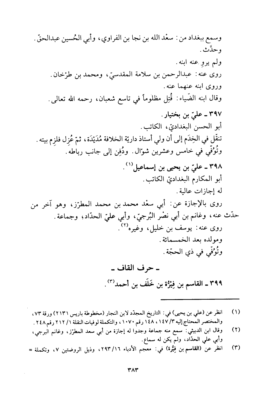 [1] انظر عن (علي بن يحيى) في: التاريخ المجدّد لابن النجار (مخطوطة باريس 2131) ورقة 73، والمختصر المحتاج إليه 3/ 147، 148 رقم 1070، والتكملة لوفيات النقلة 1/ 212 رقم 248.