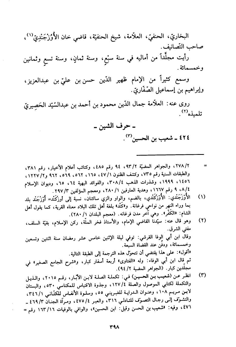 [1] الأوزجندي: الأوزكندي، بالضم، والواو والزي ساكنان، نسبة إلى أوزكند أوزجند بلد بما وراء النهر من نواحي فرغانة. و «كند» بلغة أهل تلك البلاد معناه القرية، كما يقول أهل الشام: «الكفر» . وهي آخر مدن فرغانة. (معجم البلدان 1/ 280) .