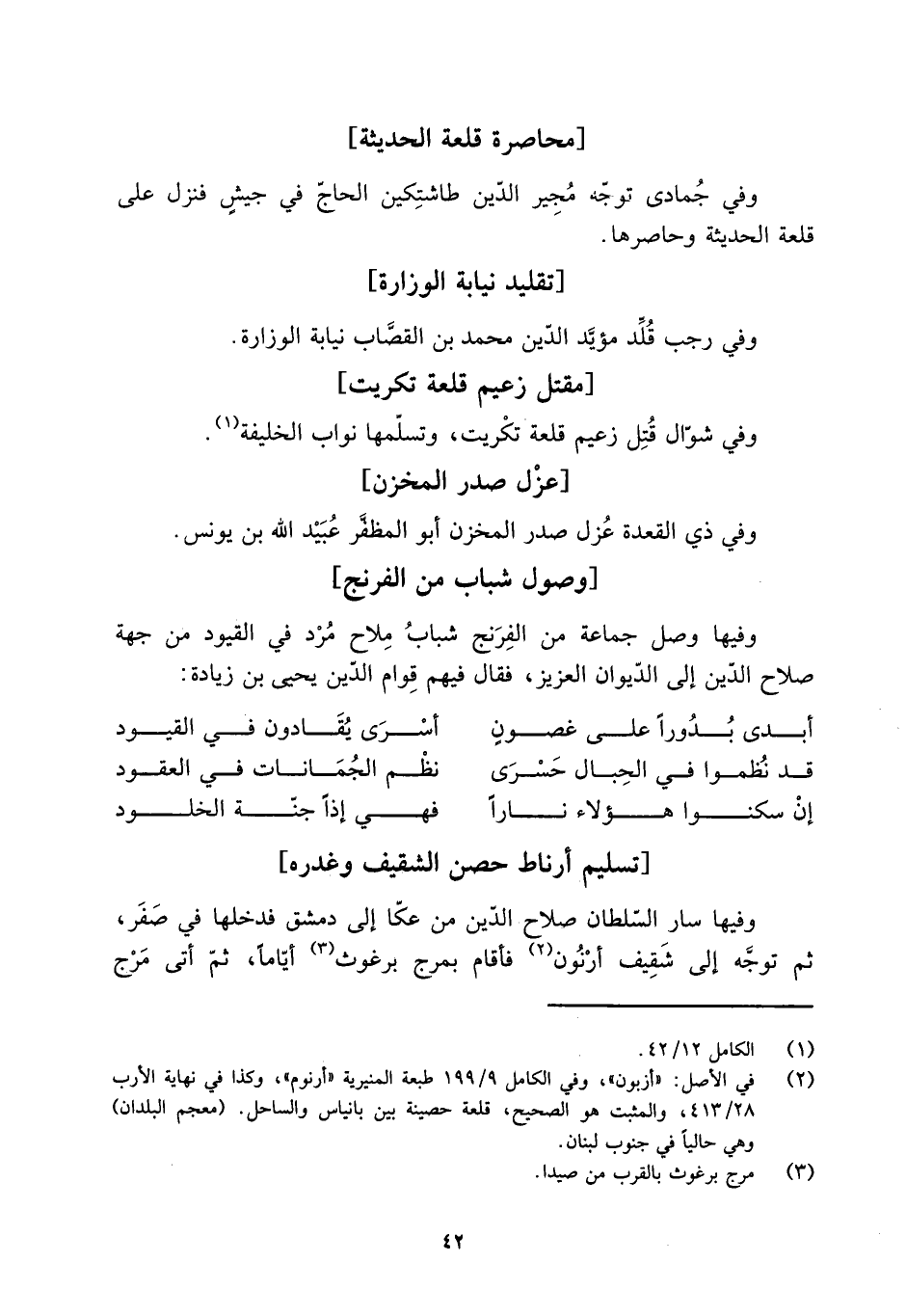 [2] في الأصل: «أزبون» ، وفي الكامل 9/ 199 طبعة المنيرية «أرنوم» ، وكذا في نهاية الأرب 28/ 413، والمثبت هو الصحيح، قلعة حصينة بين بانياس والساحل. (معجم البلدان) وهي حاليا في جنوب لبنان.