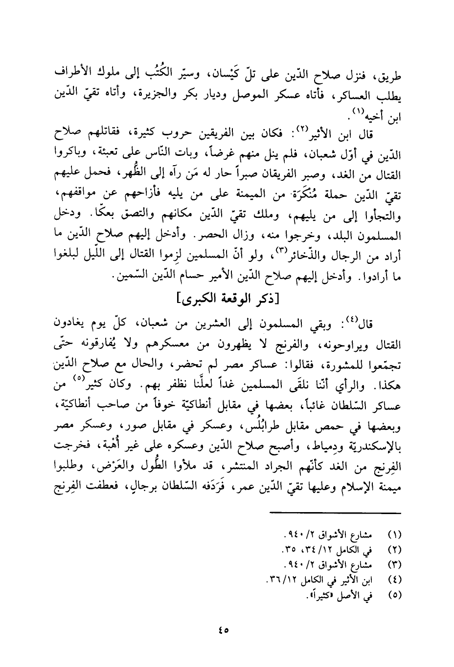 قَالَ [4] : وبقي المسلمون إلى العشرين من شعبان، كلّ يوم يغادون القتال ويراوحونه، والفِرَنج لا يظهرون من معسكرهم ولا يُفارقونه حَتَّى تجمّعوا للمشورة، فقالوا: عساكر مصر لَمْ تحضر، والحال مَعَ صلاح الدّين هكذا. والرأي أنّنا نلقَى المسلمين غدا لعلَّنا نظفر بهم. وكان كثير [5] من عساكر السّلطان غائبا، بعضها فِي مقابل أنطاكية خوفا من صاحب أنطاكية، وبعضها فِي حمص مقابل طرابُلُس، وعسكر فِي مقابل صور، وعسكر مصر بالإسكندريّة ودِمياط، وأصبح صلاح الدّين وعسكره عَلَى غير أُهْبة، فخرجت الفِرَنج منَ الغد كَأنَّهُمُ الجراد المنتشر، قد ملئوا الطُّول والعَرْض، وطلبوا ميمنة الْإِسْلَام وعليها تقيّ الدّين عُمَر، فَرَدَفه السّلطان برجالٍ، فعطفت الفِرَنج