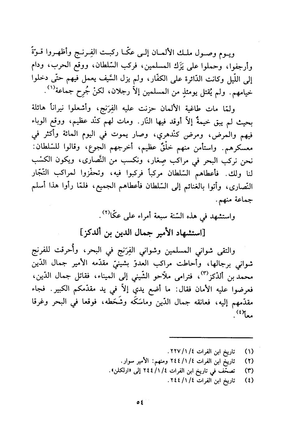 والتقى شواني المسلمين وشواني الفِرَنج فِي البحر، وأُحرقت للفِرنج شواني برجالها، وأحاطت مراكب العدوّ بشينيِّ مقدّمه الأمير جمال الدّين مُحَمَّد بْن ألْدِكِز [3] ، فترامى ملّاحو الشّيني إلى الميناء، فقاتل جمال الدّين، فعرضوا عليه الأمان فَقَالَ: ما أضع يدي إلّا فِي يد مقدّمكم الكبير. فجاء مقدّمهم إِلَيْهِ، فعانقه جمال الدّين وماسَكَه وشَحَطه، فوقعا فِي البحر وغرقا معا [4] .