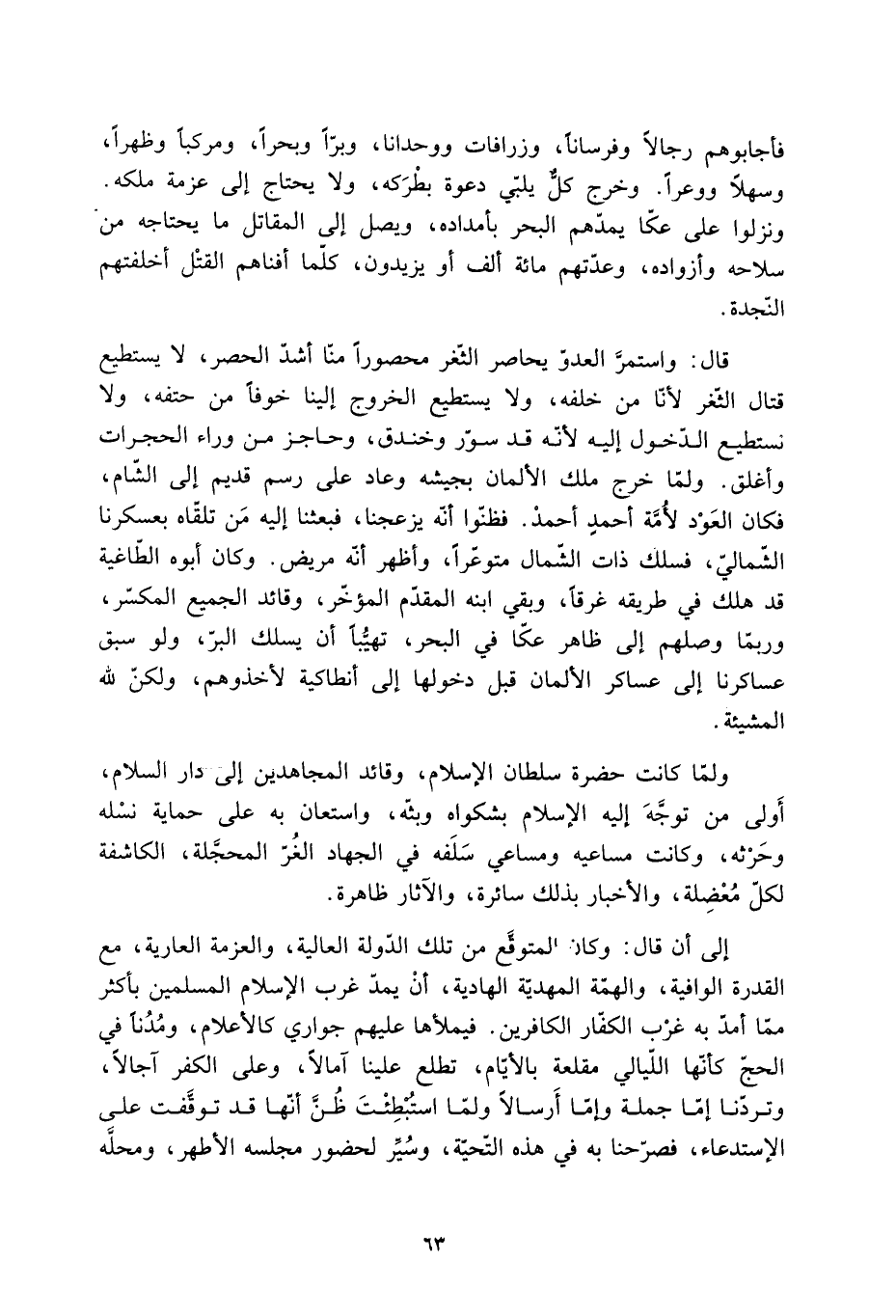 ولمّا كَانَتْ حضرة سلطان الْإِسْلَام، وقائد المجاهدين إلى دار السلام، أَولى من توجَّهَ إِلَيْهِ الْإِسْلَام بشكواه وبثّه، واستعان بِهِ عَلَى حماية نسْله وحَرْثه، وكانت مساعيه ومساعي سَلَفه فِي الجهاد الغُر المحجَّلة، الكاشفة لكلّ مُعْضِلة، والأخبار بِذَلِك سائرة، والآثار ظاهرة.