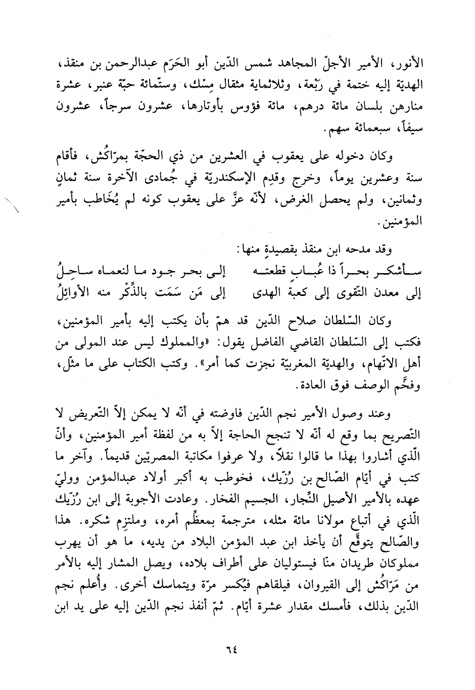 وعند وصول الأمير نجم الدّين فاوضته فِي أَنَّهُ لا يمكن إلّا التّعريض لا التّصريح بما وقع لَهُ أَنَّهُ لا تنجح الحاجة إلّا بِهِ من لفظة أمير المؤمنين، وأنّ الَّذِي أشاروا بهذا ما قَالُوا نقلا، ولا عرفوا مكاتبة المصريّين قديما. وآخر ما كتب فِي أيّام الصّالح بْن رُزّيك، فخوطب بِهِ أكبر أولاد عَبْد المؤمن ووليّ عهده بالأمير الأصيل النِّجار، الجسيم الفخار. وعادت الأجوبة إلى ابن رُزيك الَّذِي فِي أتباع مولانا مائة مثله، مترجمة بمعظِّم أمره، وملتزِم شكره. هَذَا والصّالح يتوقَّع أن يأخذ ابن عَبْد المؤمنَ البلاد من يديه، ما هُوَ أن يهرب مملوكان طريدان مِنَّا فيستوليان عَلَى أطراف بلاده، ويصل المشار إِلَيْهِ بالأمر من مَرّاكُش إلى القيروان، فيلقاهم فيُكسر مرّة ويتماسك أخرى. وأُعلم نجم الدّين بِذَلِك، فأمسك مقدار عشرة أيّام. ثُمَّ أنفذ نجم الدّين إِلَيْهِ عَلَى يد ابن