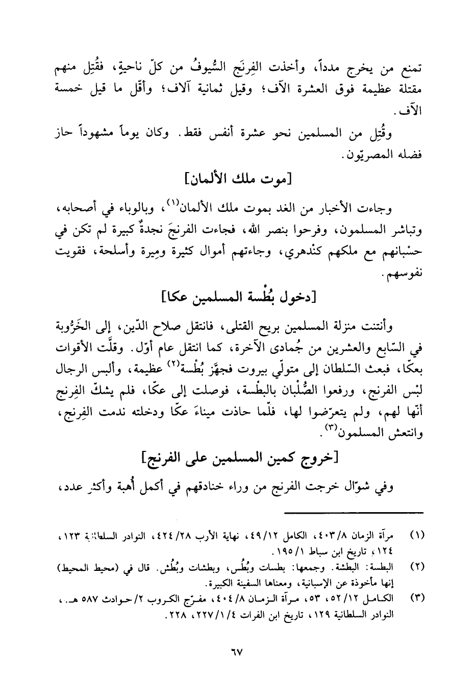 [3] الكامل 12/ 52، 53، مرآة الزمان 8/ 404، مفرّج الكروب 2/ حوادث 587 هـ.، النوادر السلطانية 129، تاريخ ابن الفرات 4/ 1/ 227، 228.