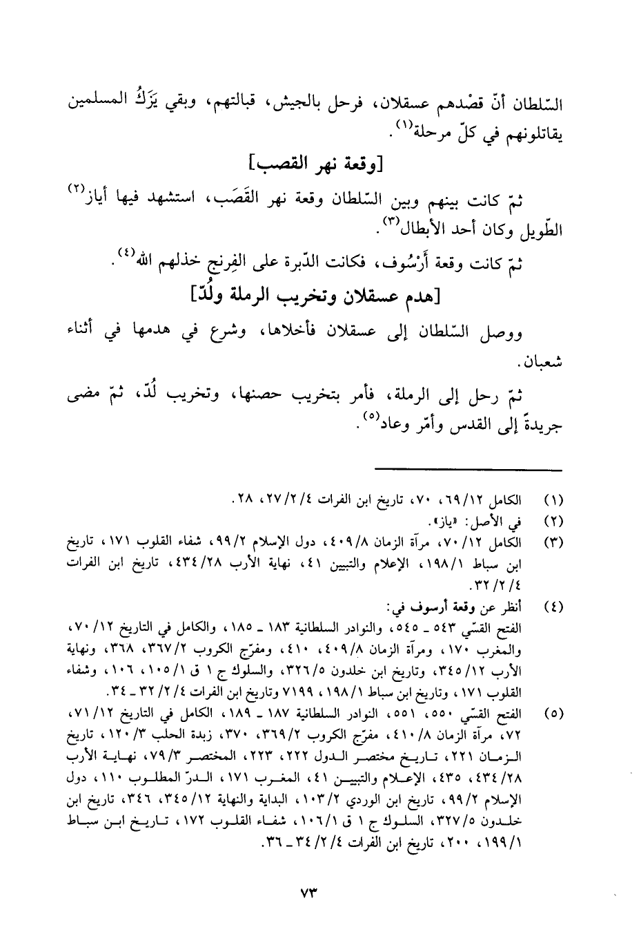 [5] الفتح القسّي 550، 551، النوادر السلطانية 187- 189، الكامل في التاريخ 12/ 71، 72، مرآة الزمان 8/ 410، مفرّج الكروب 2/ 369، 370، زبدة الحلب 3/ 120، تاريخ الزمان 221، تاريخ مختصر الدول 222، 223، المختصر 3/ 79، نهاية الأرب 28/ 434، 435، الإعلام والتبيين 41، المغرب 171، الدرّ المطلوب 110، دول الإسلام 2/ 99، تاريخ ابن الوردي 2/ 103، البداية والنهاية 12/ 345، 346، تاريخ ابن خلدون 5/ 327، السلوك ج 1 ق 1/ 106، شفاء القلوب 172، تاريخ ابن سباط 1/ 199، 200، تاريخ ابن الفرات 4/ 2/ 34- 36.