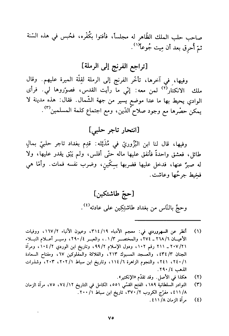 [3] النوادر السلطانية 189، الفتح القسّي 551، الكامل في التاريخ 12/ 74، 75، مرآة الزمان 8/ 411، مفرّج الكروب 2/ 370، تاريخ ابن سباط 1/ 200.