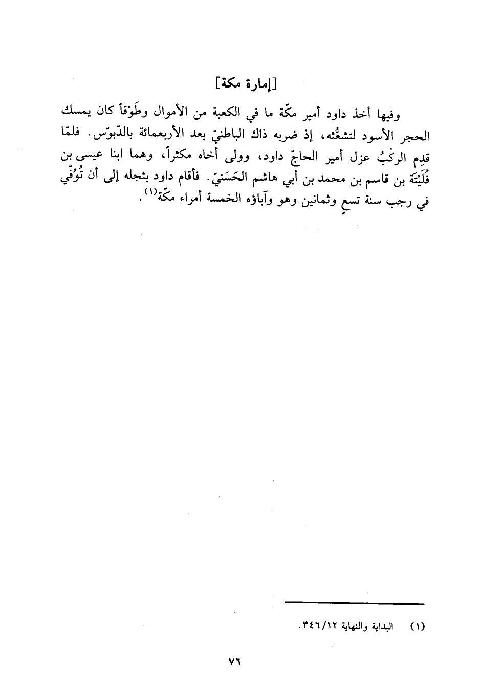 وفيها أَخَذَ دَاوُد أمير مكّة ما فِي الكعبة منَ الأموال وطَوْقًا كَانَ يمسك الحجر الأسود لتشعُّثه، إذ ضربه ذاك الباطنيّ بعد الأربعمائة بالدّبّوس. فَلَمَّا قدِم الركْبُ عزل أمير الحاجّ دَاوُد، وولى أخاه مكثرا، وهما ابنا عِيسَى بْن فُلَيْتَة بْن قاسم بْن مُحَمَّد بْن أَبِي هاشم الحَسَنيّ. فأقام دَاوُد بثجله إلى أن تُوُفّي فِي رجب سنة تسعٍ وثمانين وهو وآباؤه الخمسة أمراء مكّة [1] .