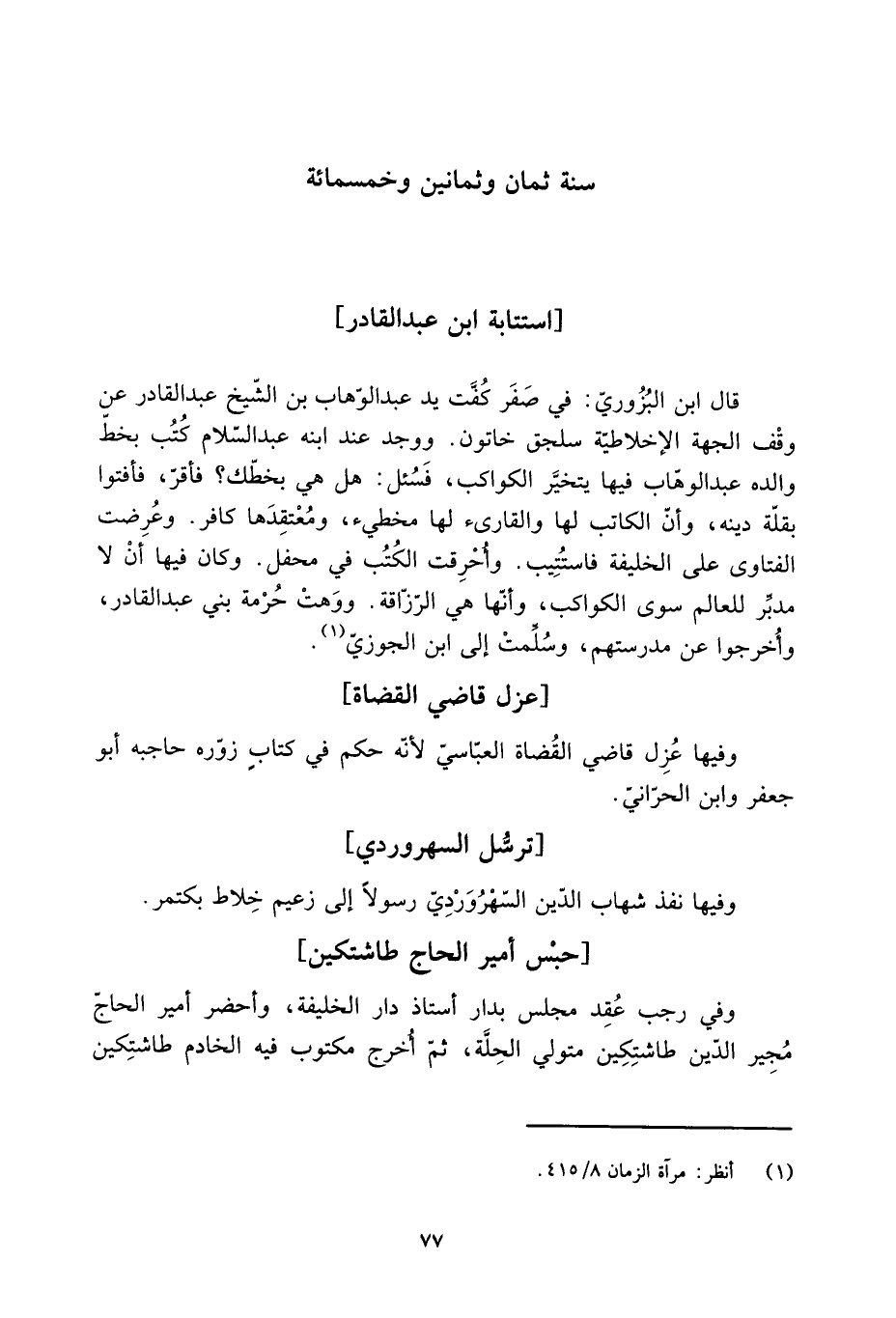 قَالَ ابن البُزُوريّ: فِي صَفَر كُفَّت يد عَبْد الوهَّاب بْن الشَّيْخ عَبْد القادر عَنْ وقف الجهة الإخلاطيّة سلجق خاتون. ووجد عِنْد ابنه عَبْد السّلام كُتُب بخطّ والده عَبْد الوهَّاب فيها يتخيَّر الكواكب، فَسُئل: هَلْ هِيَ بخطّك؟ فأقرّ، فأفتوا بقلّة دينه، وأنّ الكاتب لها والقارئ لها مخطئ، ومُعْتِقدَها كافر. وعُرِضت الفتاوى عَلَى الخليفة فاستُتِيب. وأُحْرِقت الكتُب فِي محفل. وكان فيها أنْ لا مدبِّر للعالم سوى الكواكب، وأنّها هي الرّزّاقة. ووهت حرمة بني عبد القادر، وأُخرجوا عَنْ مدرستهم، وسُلِّمتْ إلى ابن الجوزيّ [1] .