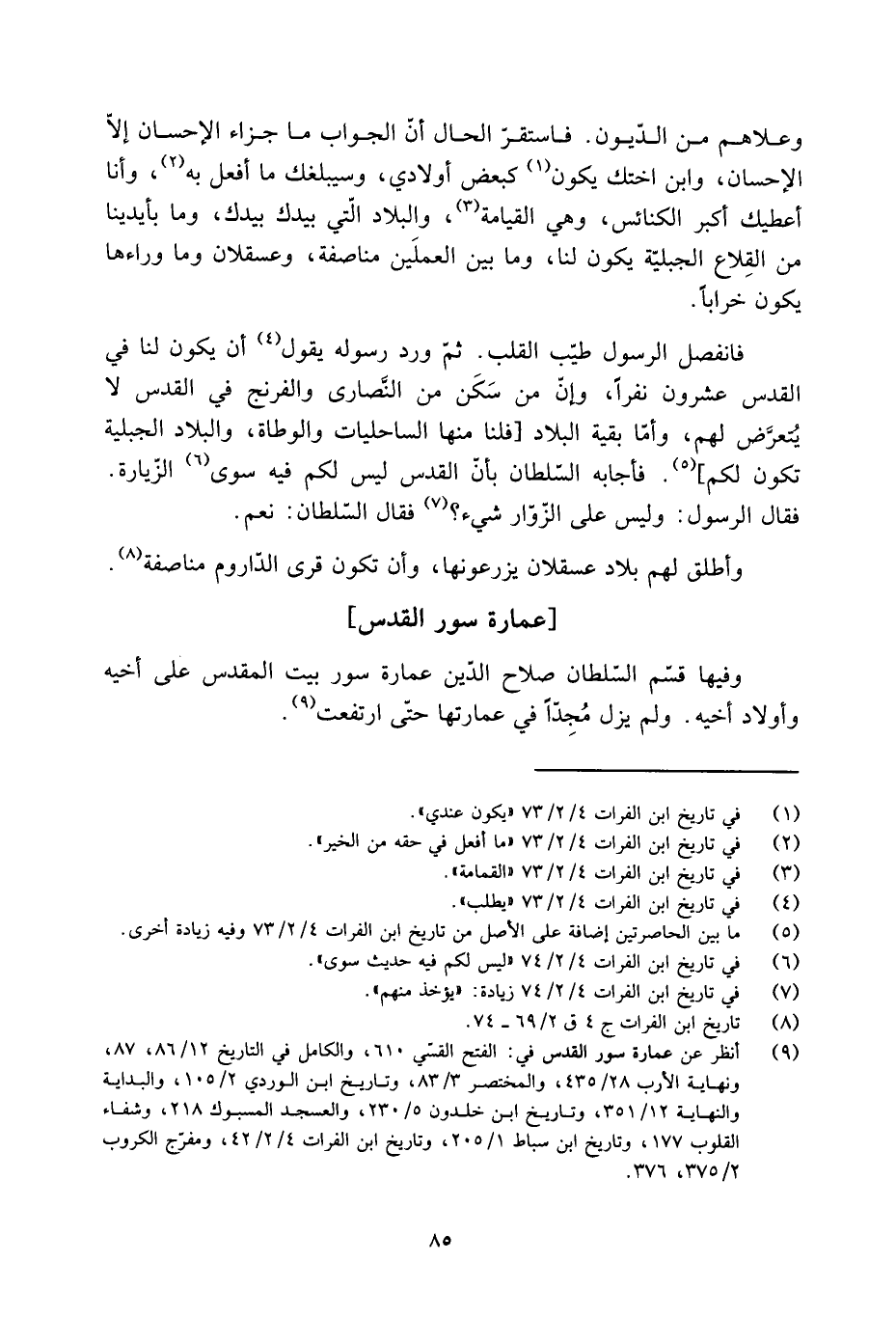 [9] انظر عن عمارة سور القدس في: الفتح القسّي 610، والكامل في التاريخ 12/ 86، 87، ونهاية الأرب 28/ 435، والمختصر 3/ 83، وتاريخ ابن الوردي 2/ 105، والبداية والنهاية 12/ 351، وتاريخ ابن خلدون 5/ 230، والعسجد المسبوك 218، وشفاء القلوب 177، وتاريخ ابن سباط 1/ 205، وتاريخ ابن الفرات 4/ 2/ 42، ومفرّج الكروب 2/ 375، 376.