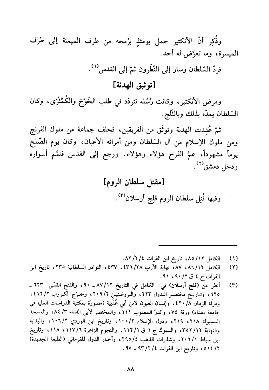 [3] انظر عن (قلج أرسلان) في: الكامل في التاريخ 12/ 87- 90، والفتح القسّي 623- 625، وتاريخ مختصر الدول 223، والروضتين 2/ 209، ومفرّج الكروب 2/ 412، ومرآة الزمان 8/ 420، وإنسان العيون لابن أبي عذيبة (مصورّة بمكتبة الدراسات العليا في جامعة بغداد) ورقة 74، والدرّ المطلوب 111، والمختصر لأبي الفداء 3/ 84، والعسجد المسبوك 218، 219، ودول الإسلام 2/ 100، وتاريخ ابن الوردي 2/ 106، والبداية والنهاية 12/ 352، والسلوك ج 1 ق 1/ 112، والنجوم الزاهرة 6/ 117، 118، وتاريخ ابن سباط 1/ 206، وشذرات الذهب 4/ 295، وأخبار الدول للقرماني (الطبعة الجديدة) 2/ 514، وتاريخ ابن الفرات 4/ 2/ 93- 95.