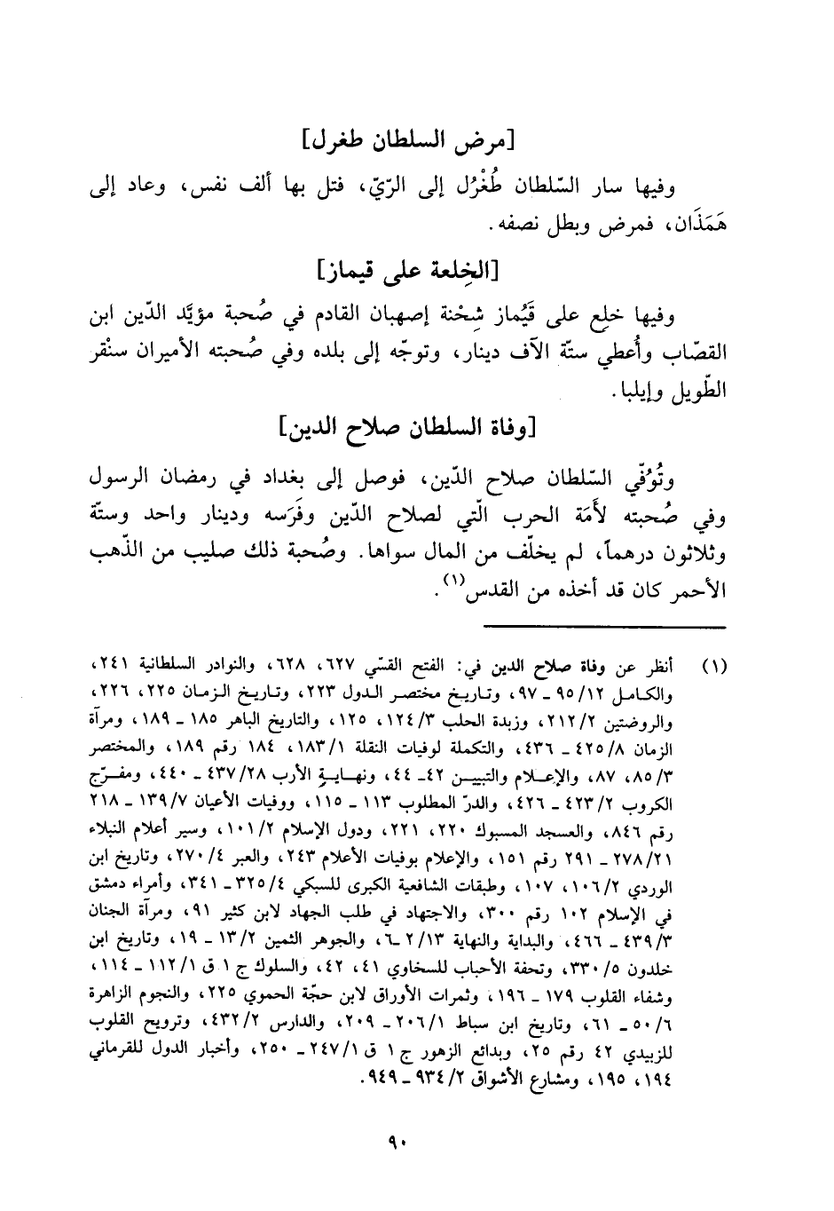 [1] انظر عن وفاة صلاح الدين في: الفتح القسّي 627، 628، والنوادر السلطانية 241، والكامل 12/ 95- 97، وتاريخ مختصر الدول 223، وتاريخ الزمان 225، 226، والروضتين 2/ 212، وزبدة الحلب 3/ 124، 125، والتاريخ الباهر 185- 189، ومرآة الزمان 8/ 425- 436، والتكملة لوفيات النقلة 1/ 183، 184 رقم 189، والمختصر 3/ 85، 87، والإعلام والتبيين 42- 44، ونهاية الأرب 28/ 437- 440، ومفرّج الكروب 2/ 423- 426، والدرّ المطلوب 113- 115، ووفيات الأعيان 7/ 139- 218 رقم 846، والعسجد المسبوك 220، 221، ودول الإسلام 2/ 101، وسير أعلام النبلاء 21/ 278- 291 رقم 151، والإعلام بوفيات الأعلام 243، والعبر 4/ 270، وتاريخ ابن الوردي 2/ 106، 107، وطبقات الشافعية الكبرى للسبكي 4/ 325- 341، وأمراء دمشق في الإسلام 102 رقم 300، والاجتهاد في طلب الجهاد لابن كثير 91، ومرآة الجنان 3/ 439- 466، والبداية والنهاية 13/ 2- 6، والجوهر الثمين 2/ 13- 19، وتاريخ ابن خلدون 5/ 330، وتحفة الأحباب للسخاوي 41، 42، والسلوك ج 1 ق 1/ 112- 114، وشفاء القلوب 179- 196، وثمرات الأوراق لابن حجّة الحموي 225، والنجوم الزاهرة 6/ 50- 61، وتاريخ ابن سباط 1/ 206- 209، والدارس 2/ 432، وترويح القلوب للزبيدي 42 رقم 25، وبدائع الزهور ج 1 ق 1/ 247- 250، وأخبار الدول للقرماني 194، 195، ومشارع الأشواق 2/ 934- 949.