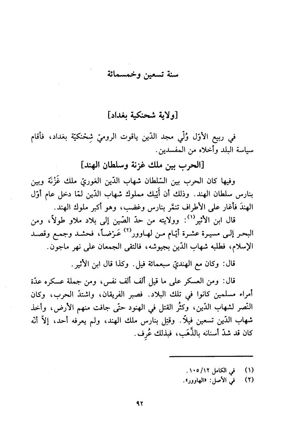 وفيها كان الحرب بَيْنَ السّلطان شهاب الدّين الغوريّ ملك غَزْنَة وَبَيْنَ بنارس سلطان الهند. وذلك أن أَيْبك مملوك شهاب الدّين لمّا دخل عام أوّل الهندَ فأغار عَلَى الأطراف تنمَّر بنارس وغضب، وَهُوَ أكبر ملوك الهند.