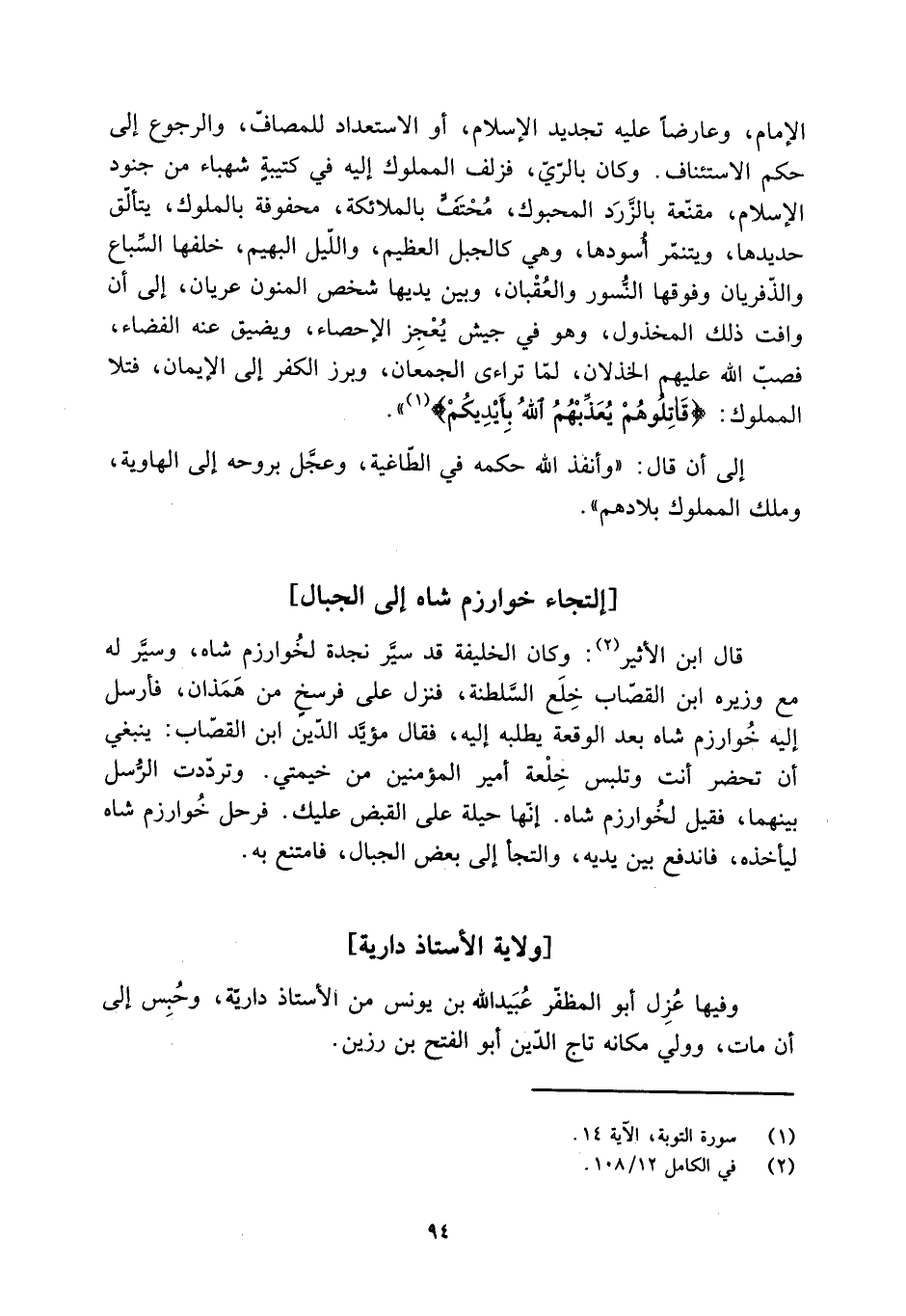 الْإِمَام، وعارضا عليه تجديد الْإِسْلَام، أَوِ الاستعداد للمصافّ، والرجوع إلى حكم الاستئناف. وكان بالرّيّ، فزلف المملوك إِلَيْهِ فِي كتيبةٍ شهباء من جنود الْإِسْلَام، مقنعة بالزَّرَد المحبوك، مُحْتَفٍّ بالملائكة، محفوفة بالملوك، يتألّق حديدها، ويتنمّر أُسودها، وهي كالجبل العظيم، واللّيل البهيم، خلفها السِّباع والذّفريان وفوقها النُّسور والعُقْبان، وبين يديها شخص المنون عريان، إلى أن وافت ذَلِكَ المخذول، وَهُوَ فِي جيش يُعْجِز الإحصاء، ويضيق عَنْهُ الفضاء، فصبّ اللَّه عليهم الخذلان، لمّا تراءى الجمعان، وبرز الكفر إلى الْإِيمَان، فتلا المملوك: قاتِلُوهُمْ يُعَذِّبْهُمُ الله بِأَيْدِيكُمْ 9: 14 [1] » .