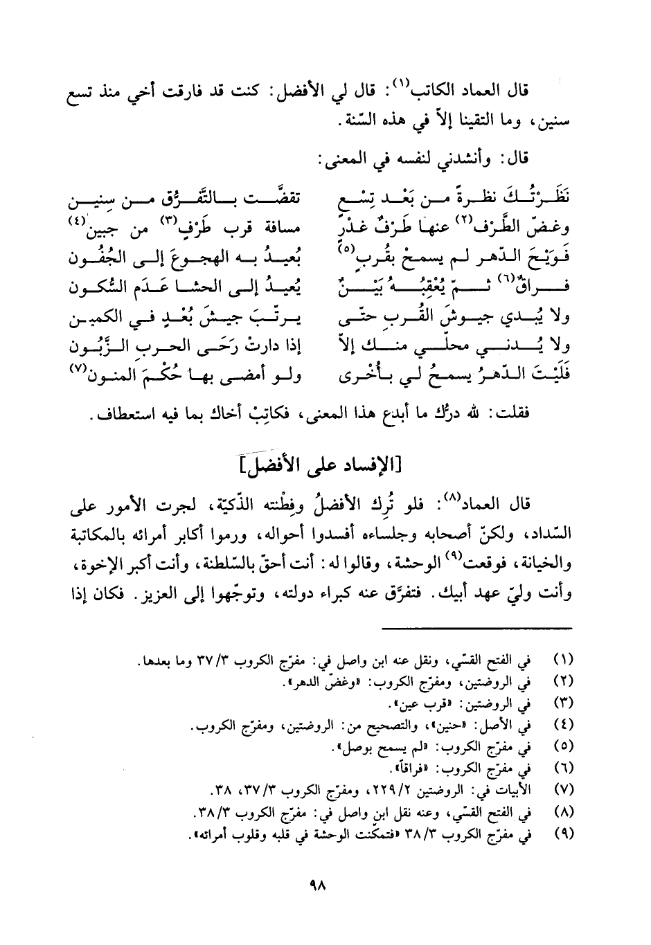 قَالَ العماد [8] : فلو تُرِك الأفضلُ وفِطْنته الذّكيّة، لجرت الأمور عَلَى السّداد، ولكنّ أصحابه وجلساءه أفسدوا أحواله، ورموا أكابر أمرائه بالمكاتبة والخيانة، فوقعت [9] الوحشة، وقالوا لَهُ: أَنْت أحقّ بالسّلطنة، وأنت أكبر الإخوة، وأنت وليّ عهد أبيك. فتفرَّق عَنْهُ كبراء دولته، وتوجّهوا إلى الْعَزِيز. فكان إذا
