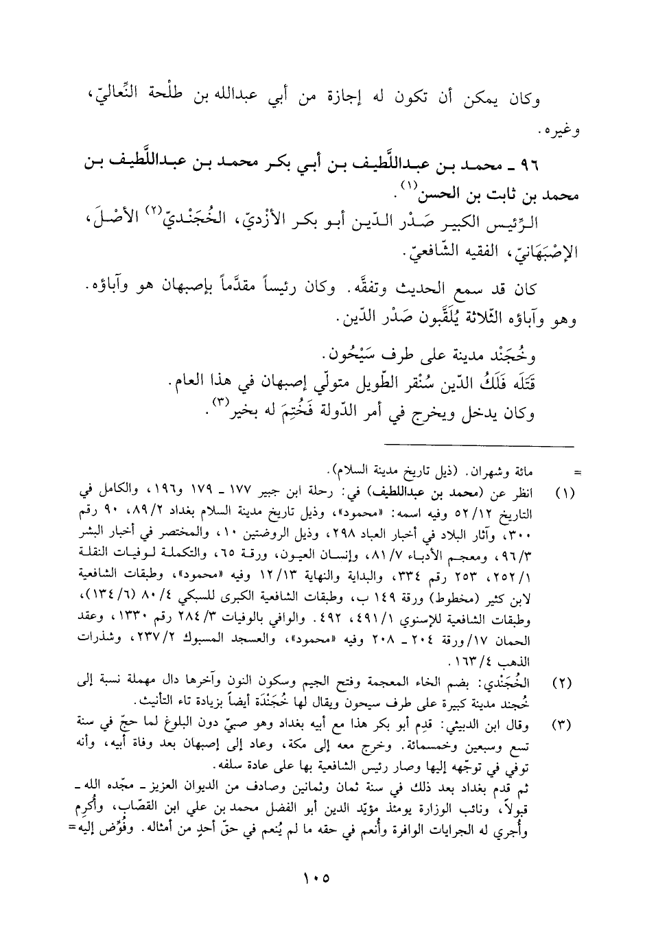 [1] انظر عن (محمد بن عبد اللطيف) في: رحلة ابن جبير 177- 179 و 196، والكامل في التاريخ 12/ 52 وفيه اسمه: «محمود» ، وذيل تاريخ مدينة السلام بغداد 2/ 89، 90 رقم 300، وآثار البلاد في أخبار العباد 298، وذيل الروضتين 10، والمختصر في أخبار البشر 3/ 96، ومعجم الأدباء 7/ 81، وإنسان العيون، ورقة 65، والتكملة لوفيات النقلة 1/ 252، 253 رقم 334، والبداية والنهاية 13/ 12 وفيه «محمود» ، وطبقات الشافعية لابن كثير (مخطوط) ورقة 149 ب، وطبقات الشافعية الكبرى للسبكي 4/ 80 (6/ 134) ، وطبقات الشافعية للإسنويّ 1/ 491، 492. والوافي بالوفيات 3/ 284 رقم 1330، وعقد الحمان 17/ ورقة 204- 208 وفيه «محمود» ، والعسجد المسبوك 2/ 237، وشذرات الذهب 4/ 163.