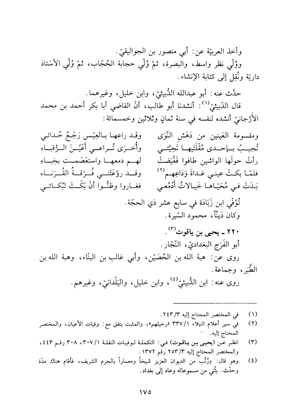 [3] انظر عن (يحيى بن ياقوت) في: التكملة لوفيات النقلة 1/ 307، 308 رقم 443، والمختصر المحتاج إليه 3/ 253 رقم 1372.