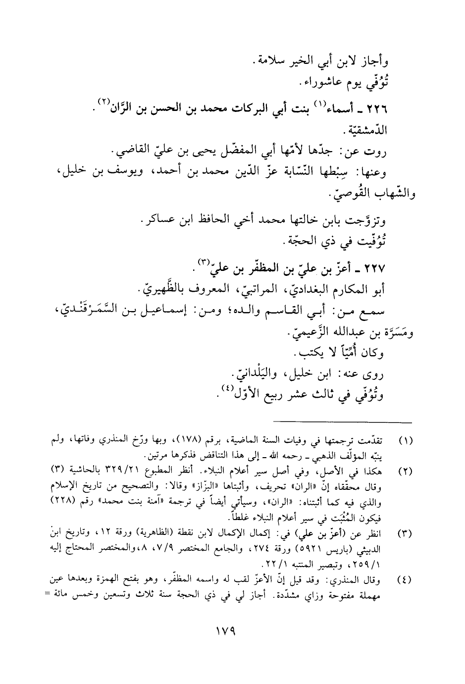 [3] انظر عن (أعزّ بن علي) في: إكمال الإكمال لابن نقطة (الظاهرية) ورقة 12، وتاريخ ابن الدبيثي (باريس 5921) ورقة 274، والجامع المختصر 9/ 7، 8، والمختصر المحتاج إليه 1/ 259، وتبصير المنتبه 1/ 22.
