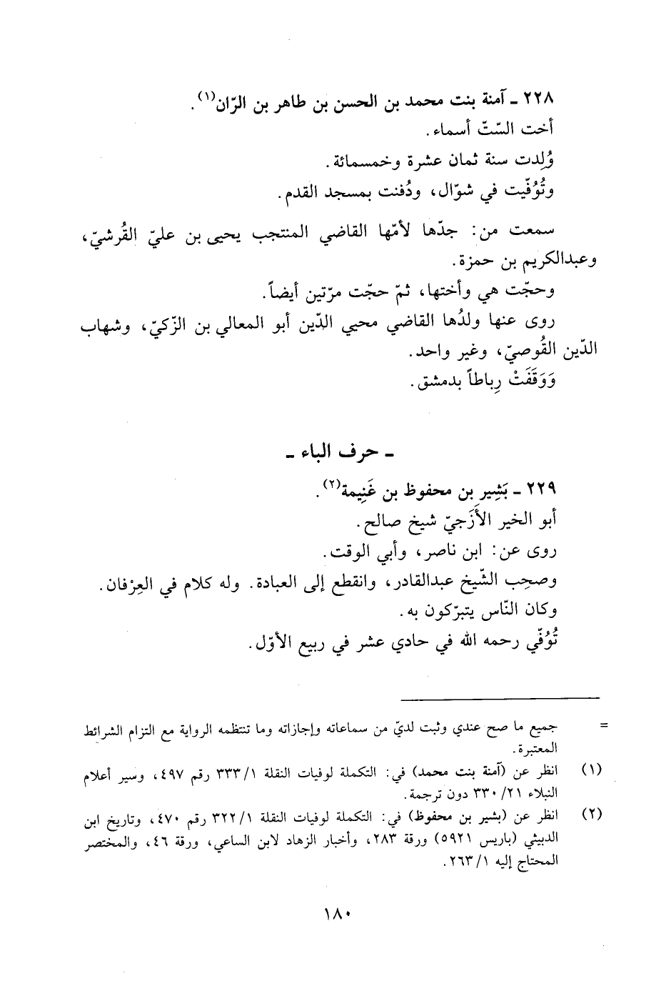 [2] انظر عن (بشير بن محفوظ) في: التكملة لوفيات النقلة 1/ 322 رقم 470، وتاريخ ابن الدبيثي (باريس 5921) ورقة 283، وأخبار الزهاد لابن الساعي، ورقة 46، والمختصر المحتاج إليه 1/ 263.