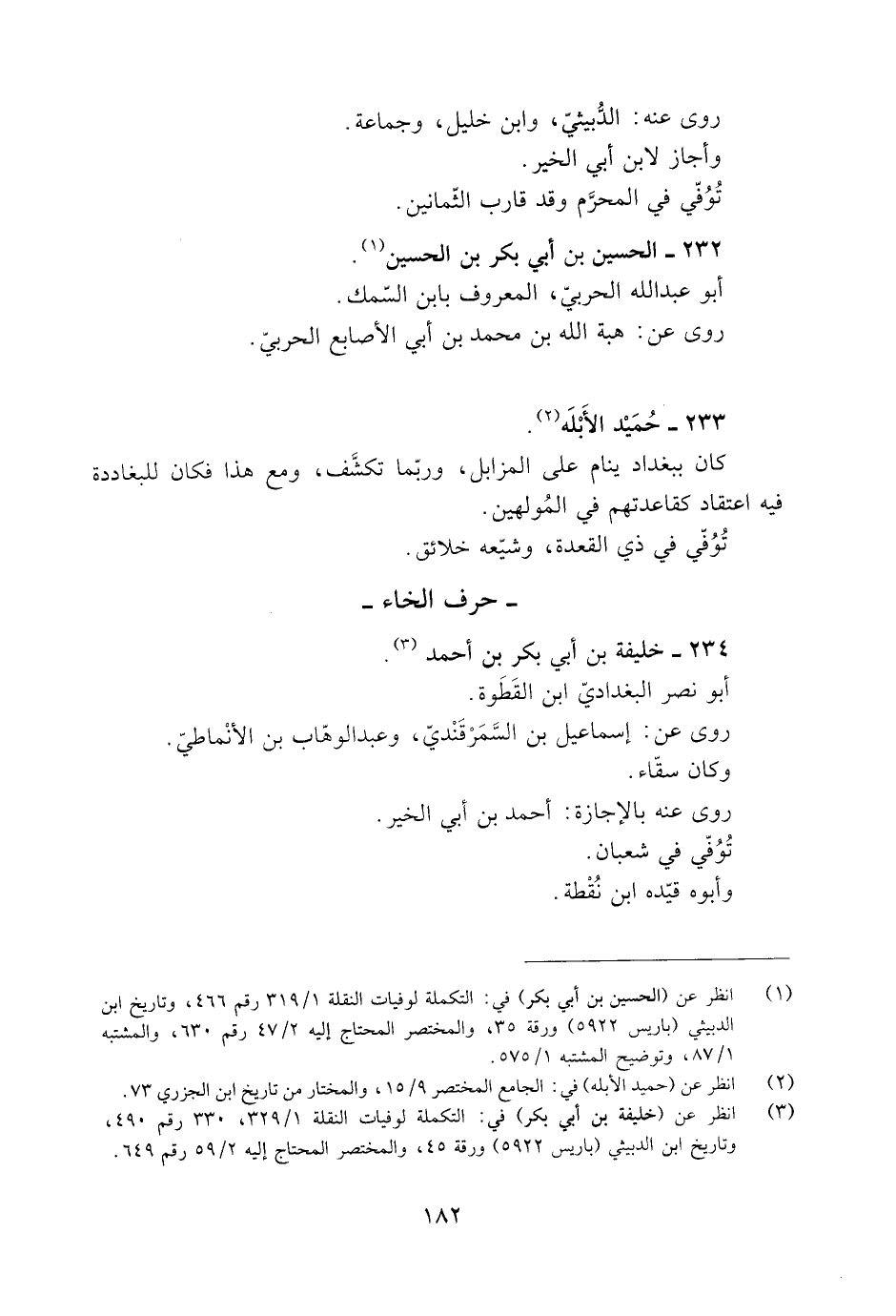 [3] انظر عن (خليفة بن أبي بكر) في: التكملة لوفيات النقلة 1/ 329، 330 رقم 490، وتاريخ ابن الدبيثي (باريس 5922) ورقة 45، والمختصر المحتاج إليه 2/ 59 رقم 649.