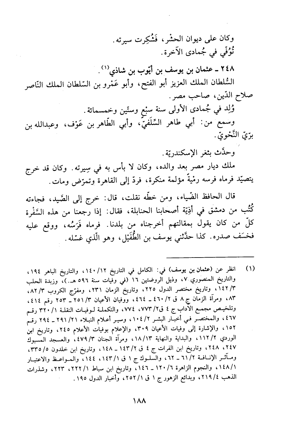 [1] انظر عن (عثمان بن يوسف) في: الكامل في التاريخ 12/ 140، والتاريخ الباهر 194، والتاريخ المنصوري 7، وذيل الروضتين 16 (في وفيات سنة 596 هـ.، وزبدة الحلب 3/ 142، وتاريخ مختصر الدول 225، وتاريخ الزمان 231، ومفرّج الكروب 3/ 82، 83، ومرآة الزمان ج 8 ق 2/ 460- 464، ووفيات الأعيان 3/ 251- 253 رقم 414، وتلخيص مجمع الآداب ج 4 ق 2/ 773، 774، والتكملة لوفيات النقلة 1/ 320 رقم 467، والمختصر في أخبار البشر 2/ 104، وسير أعلام النبلاء 21/ 291- 294 رقم 152، والإشارة إلى وفيات الأعيان 309، والإعلام بوفيات الأعلام 245، وتاريخ ابن الوردي 2/ 112، والبداية والنهاية 13/ 18، ومرآة الجنان 3/ 479، والعسجد المسبوك 247، 248، وتاريخ ابن الفرات ج 4 ق 2/ 143- 148، وتاريخ ابن خلدون 5/ 335، ومآثر الإنافة 2/ 61- 62، والسلوك ج 1 ق 1/ 143، 144، والمواعظ والاعتبار 1/ 148، والنجوم الزاهرة 6/ 120- 146، وتاريخ ابن سباط 1/ 222، 223، وشذرات الذهب 4/ 219، وبدائع الزهور ج 1 ق 1/ 252، وأخبار الدول 195.