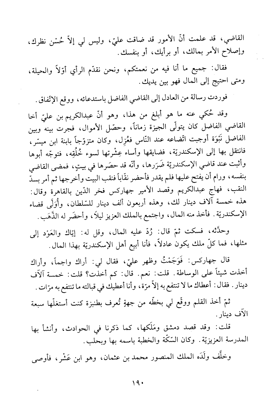 هَذِهِ خمسة آلاف دينار لك، وهذه أربعون ألف دينار للسّلطان، وأُوَلَّى قضاء الإسكندريّة. فأخذ منه المال، واجتمع بالملك الْعَزِيز ليلا، وأحضَر له الذَّهَب.