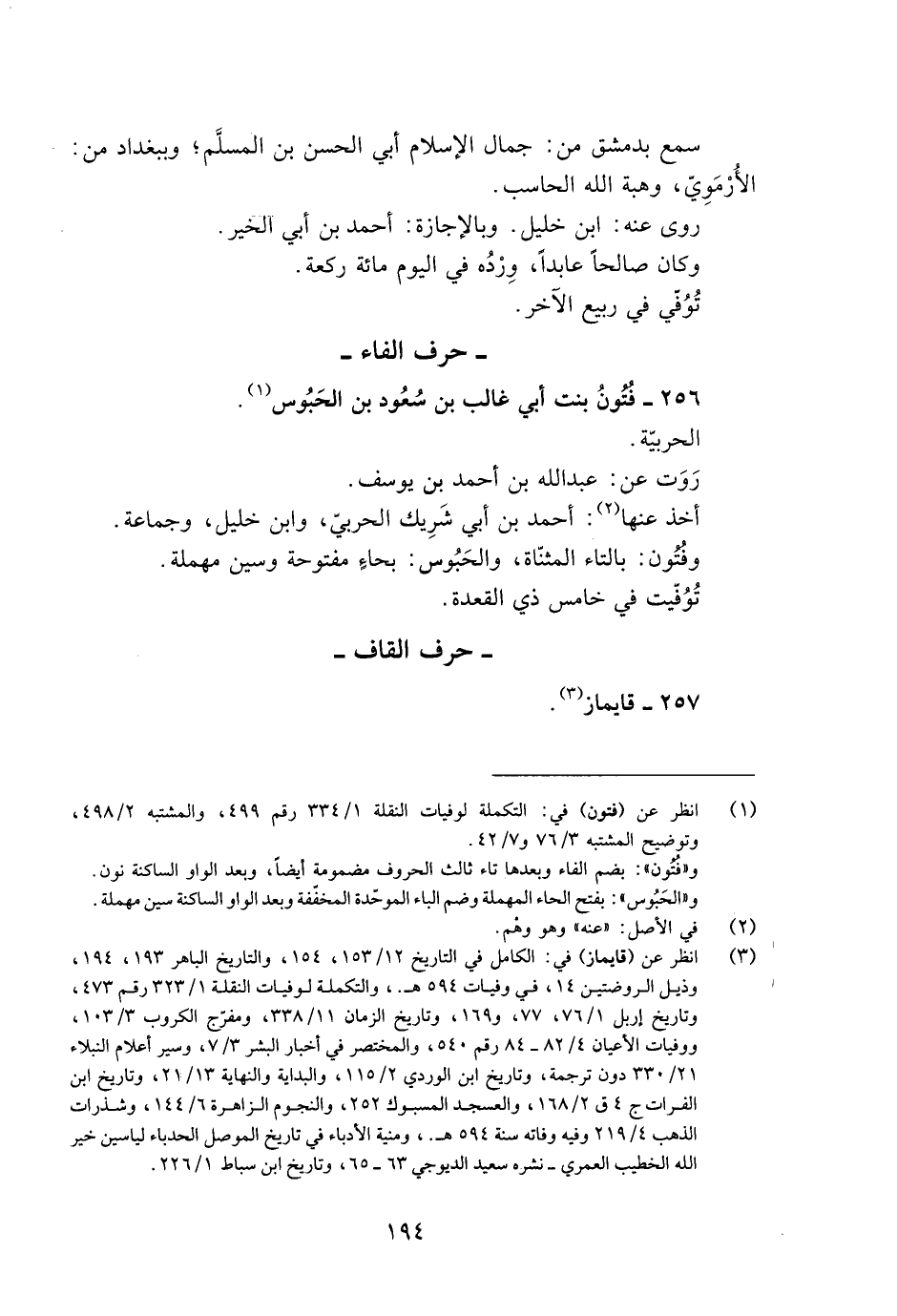 [1] انظر عن (فتون) في: التكملة لوفيات النقلة 1/ 334 رقم 499، والمشتبه 2/ 498، وتوضيح المشتبه 3/ 76 و 7/ 42.