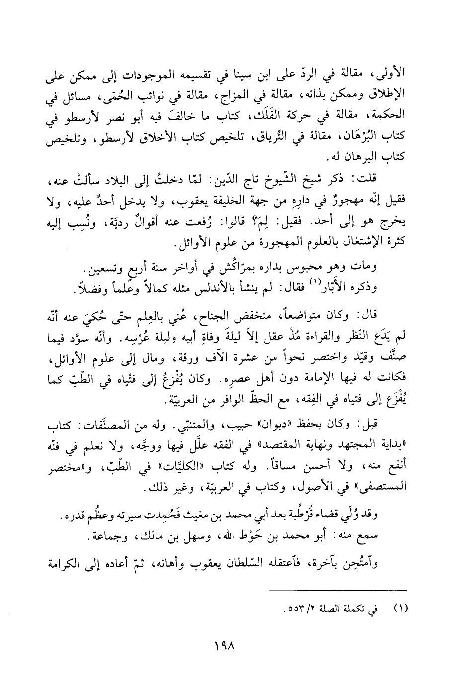 قلت: ذكر شيخ الشّيوخ تاج الدّين: لمّا دخلتُ إِلَى البلاد سألتُ عَنْهُ، فَقِيل إنّه مهجورٌ فِي دارِهِ من جهة الخليفة يعقوب، ولا يدخل أحدٌ عليه، ولا يخرج هُوَ إِلَى أحد. فَقِيل: لِمَ؟ قَالُوا: رُفعت عَنْهُ أقوالٌ رديَّة، ونُسِب إليه كثرة الاشتغال بالعلوم المهجورة من علوم الأوائل.