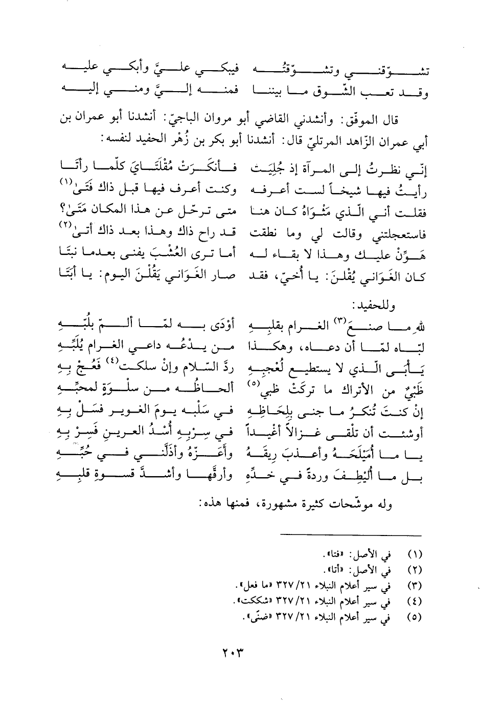 قال الموفّق: وأنشدني القاضي أبو مروان الباجيّ: أنشدنا أبو عِمْرَانَ بْن أَبِي عِمْرَانَ الزّاهد المرتليّ قال: أنشدنا أبو بَكْر بْن زُهْر الحفيد لنفسه: