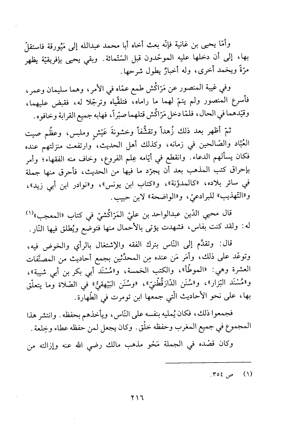 قال: وتقدَّم إلى النّاس بترك الفقه والاشتغال بالرأي والخوض فِيهِ، وتوعّد على ذلك، وأمَر مَن عنده مِن المحدِّثين بجمع أحاديث من المصنَّفات العشرة وهي: «الموطّأ» ، والكتب الخمسة، و «مُسْنَد أَبِي بَكْر بْن أَبِي شَيْبَة» ، و «مُسْنَد البزّار» ، و «سنن الدّار الدَّارَقُطْنِيّ» ، «وسُنَن البَيْهقيُّ» فِي الصّلاة وما يتعلّق بها، على نحو الأحاديث الّتي جمعها ابن تومرت فِي الطّهارة.