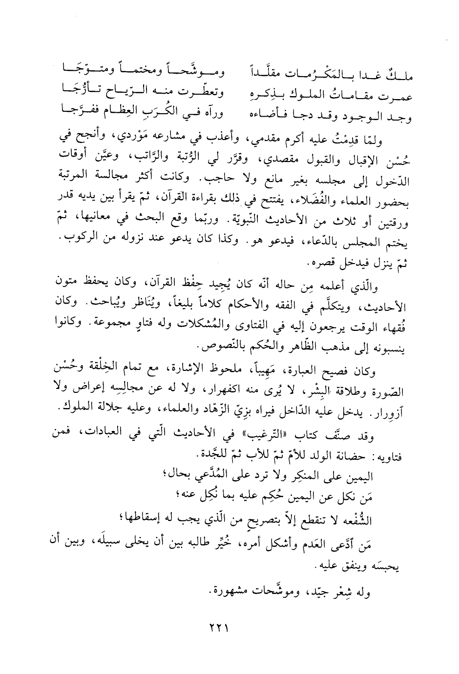 ولمّا قدِمْتُ عليه أكرم مقدمي، وأعذب فِي مشارعه مَوْردي، وأنجح فِي حُسْن الإقبال والقبول مقصدي، وقرَّر لي الرُّتبة والرَّاتب، وعيَّن أوقات الدّخول إِلَى مجلسه بغير مانع ولا حاجب. وكانت أكثر مجالسة المرتبة بحضور العلماء والفُضَلاء، يفتتح فِي ذلك بقراءة القرآن، ثُمَّ يقرأ بين يديه قدر ورقتين أو ثلاث من الأحاديث النّبويَّة. وربّما وقع البحث فِي معانيها، ثُمَّ يختم المجلس بالدّعاء، فيدعو هُوَ. وكذا كان يدعو عند نزوله من الركوب.