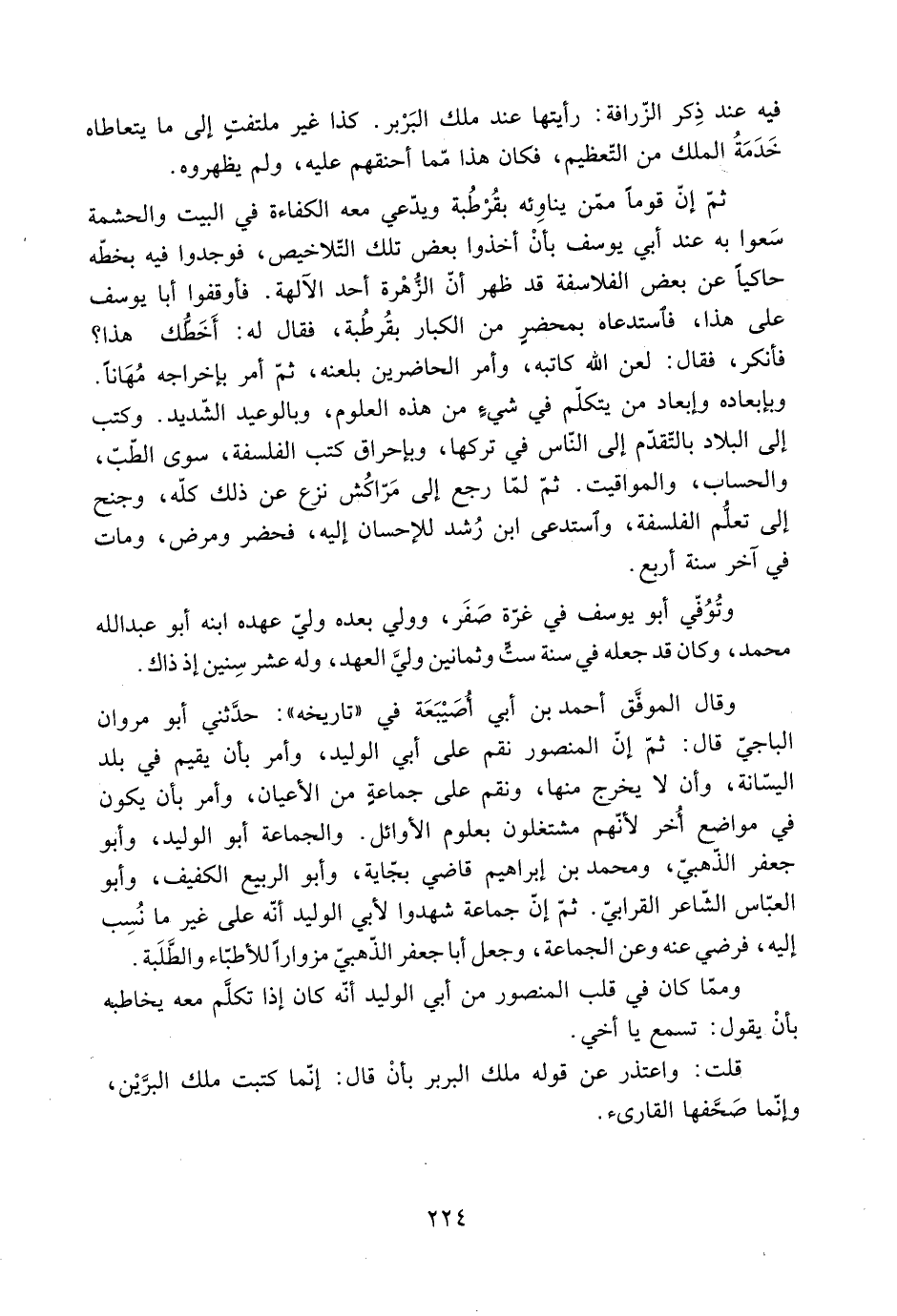 وبإبعاده وإبعاد من يتكلّم فِي شيءٍ من هَذِهِ العلوم، وبالوعيد الشّديد. وكتب إِلَى البلاد بالتّقدّم إِلَى النّاس فِي تركها، وبإحراق كتب الفلسفة، سوى الطّبّ، والحساب، والمواقيت. ثمّ لمّا رجع إِلَى مَرّاكُش نزع عن ذلك كلّه، وجنح إِلَى تعلُّم الفلسفة، واستدعى ابن رُشد للإحسان إليه، فحضر ومرض، ومات فِي آخر سنة أربع.
