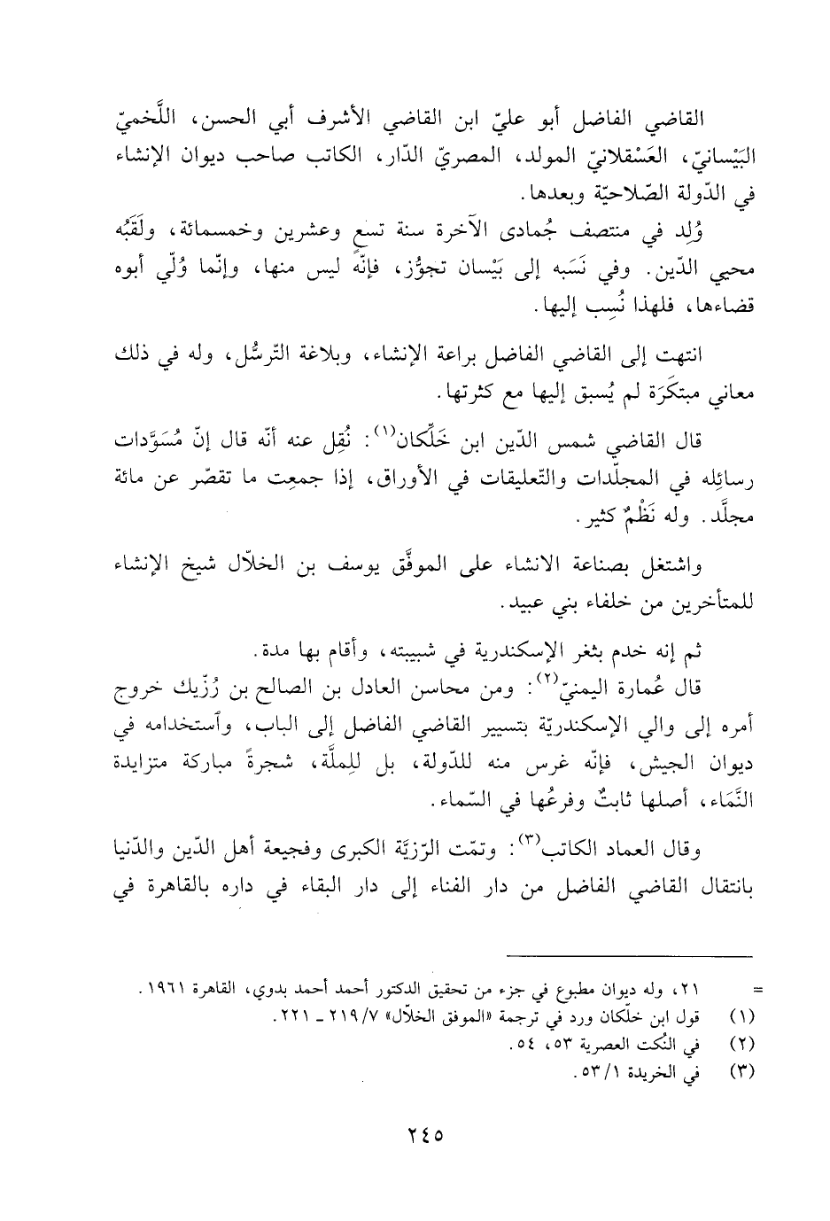 القاضي الفاضل أبو عليّ ابن القاضي الأشرف أَبِي الْحَسَن، اللَّخميّ البَيْسانيّ، العَسْقلانيّ، المولد، المصريّ الدّار، الكاتب صاحب ديوان الإنشاء فِي الدّولة الصّلاحيَّة وبعدها.