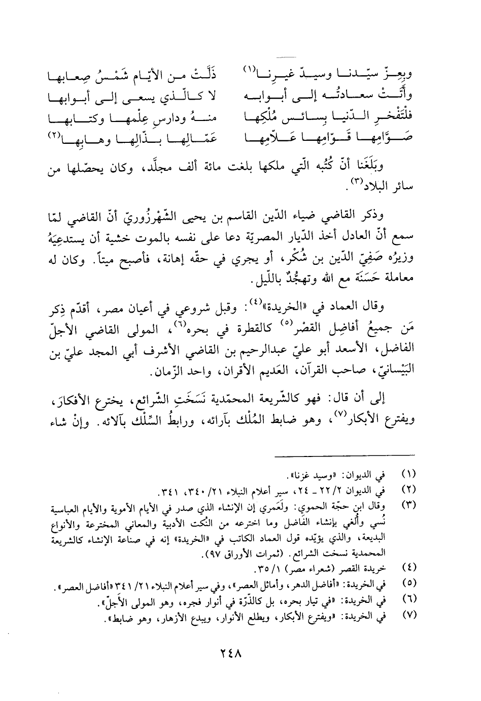 [5] في الخريدة: «أفاضل الدهر، وأمائل العصر» ، وفي سير أعلام النبلاء 21/ 341 «أفاضل العصر» .