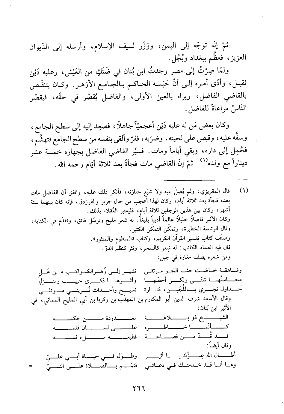 [1] قال المقريزي: ولم يصلّ عليه ولا شيّع جنازته، فأنكر ذلك عليه، واتفق أن الفاضل مات بعده فجأة بعد ثلاثة أيام، وكان لهذا أعجب من حال جرير والفرزدق، فإنه كان بينهما ستة أشهر، وكان بين هذين الرجلين ثلاثة أيام، فليعتبر العقلاء بذلك.