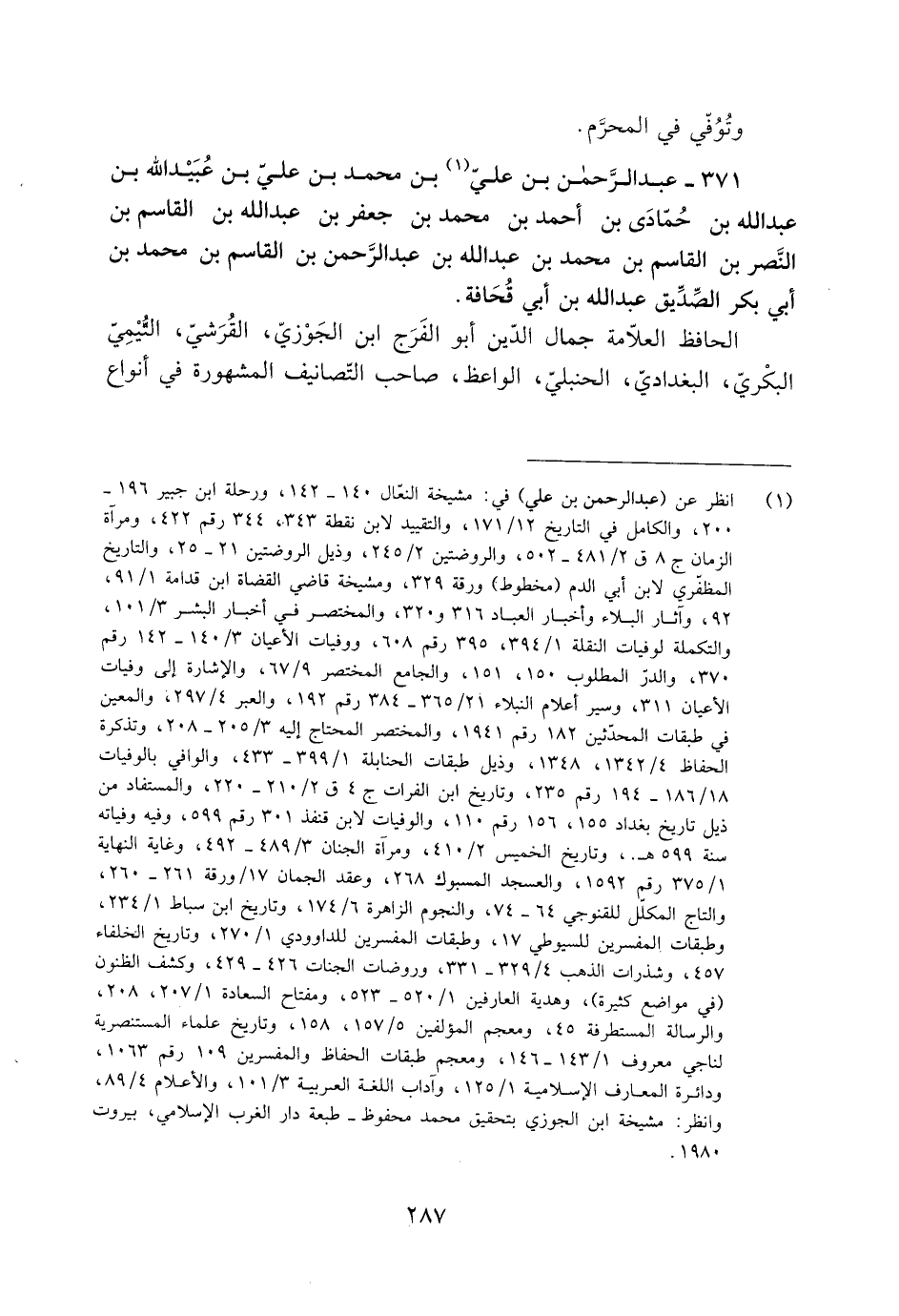 [1] انظر عن (عبد الرحمن بن علي) في: مشيخة النعّال 140- 142، ورحلة ابن جبير 196- 200، والكامل في التاريخ 12/ 171، والتقييد لابن نقطة 343، 344 رقم 422، ومرآة الزمان ج 8 ق 2/ 481- 502، والروضتين 2/ 245، وذيل الروضتين 21- 25، والتاريخ المظفّري لابن أبي الدم (مخطوط) ورقة 329، ومشيخة قاضي القضاة ابن قدامة 1/ 91، 92، وآثار البلاء وأخبار العباد 316 و 320، والمختصر في أخبار البشر 3/ 101، والتكملة لوفيات النقلة 1/ 394، 395 رقم 608، ووفيات الأعيان 3/ 140- 142 رقم 370، والدرّ المطلوب 150، 151، والجامع المختصر 9/ 67، والإشارة إلى وفيات الأعيان 311، وسير أعلام النبلاء 21/ 365- 384 رقم 192، والعبر 4/ 297، والمعين في طبقات المحدّثين 182 رقم 1941، والمختصر المحتاج إليه 3/ 205- 208، وتذكرة الحفاظ 4/ 1342، 1348، وذيل طبقات الحنابلة 1/ 399- 433، والوافي بالوفيات 18/ 186- 194 رقم 235، وتاريخ ابن الفرات ج 4 ق 2/ 210- 220، والمستفاد من ذيل تاريخ بغداد 155، 156 رقم 110، والوفيات لابن قنفذ 301 رقم 599، وفيه وفياته سنة 599 هـ.، وتاريخ الخميس 2/ 410، ومرآة الجنان 3/ 489- 492، وغاية النهاية 1/ 375 رقم 1592، والعسجد المسبوك 268، وعقد الجمان 17/ ورقة 261- 260، والتاج المكلّل للقنوجي 64- 74، والنجوم الزاهرة 6/ 174، وتاريخ ابن سباط 1/ 234، وطبقات المفسرين للسيوطي 17، وطبقات المفسرين للداوديّ 1/ 270، وتاريخ الخلفاء 457، وشذرات الذهب 4/ 329- 331، وروضات الجنات 426- 429، وكشف الظنون (في مواضع كثيرة) ، وهدية العارفين 1/ 520- 523، ومفتاح السعادة 1/ 207، 208، والرسالة المستطرفة 45، ومعجم المؤلفين 5/ 157، 158، وتاريخ علماء المستنصرية لناجي معروف 1/ 143- 146، ومعجم طبقات الحفاظ والمفسرين 109 رقم 1063، ودائرة المعارف الإسلامية 1/ 125، وآداب اللغة العربية 3/ 101، والأعلام 4/ 89، وانظر: مشيخة ابن الجوزي بتحقيق محمد محفوظ- طبعة دار الغرب الإسلامي، بيروت 1980.