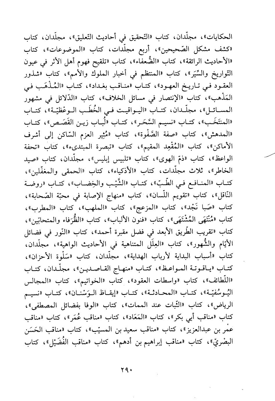 الحكايات» ، مجلّدان، كتاب «التّحقيق فِي أحاديث التّعليق» ، مجلّدان، كتاب «كشف مشكل الصّحيحين» ، أربع مجلّدات، كتاب «الموضوعات» ، كتاب «الأحاديث الرائقة» ، كتاب «الضُّعفاء» ، كتاب «تلقيح فهوم أَهْل الأثر فِي عيون التّواريخ والسِّيَر» ، كتاب «المنتظم فِي أخبار الملوك والأمم» ، كتاب «شذور العقود فِي تاريخ العهود» ، كتاب «مناقب بغداد» ، كتاب «المُذْهَب فِي المَذْهب» ، كتاب «الإنتصار فِي مسائل الخلاف» ، كتاب «الدّلائل فِي مشهور المسائل» ، مجلّدان، كتاب «اليواقيت فِي الخُطَب الوعْظيَّة» ، كتاب «المنتَخَب» ، كتاب «نسيم السَّحَر» ، كتاب «لُباب زين القَصَص» ، كتاب «المدهش» ، كتاب «صفة الصَّفْوة» ، كتاب «مُثِير العزم السّاكن إِلَى أشرف الأماكن» ، كتاب «المُقْعِد المقيم» ، كتاب «تبصرة المبتدئ» ، كتاب «تحفة الواعظ» ، كتاب «ذمّ الهوى» ، كتاب «تلبيس إبليس» ، مجلّدان، كتاب «صيد الخاطر» ، ثلاث مجلّدات، كتاب «الأذكياء» ، كتاب «الحمقى والمغفّلين» ، كتاب «المنافع فِي الطّبّ» ، كتاب «الشَّيْب والخِضاب» ، كتاب «روضة النّاقل» ، كتاب «تقويم اللّسان» ، كتاب «منهاج الإصابة فِي محبَّة الصّحابة» ، كتاب «صَبا نَجْد» ، كتاب «المزعج» ، كتاب «الملهب» ، كتاب «المطرب» ، كتاب «مُنْتَهَى المُشْتَهَى» ، كتاب «فنون الألباب» ، كتاب «الظُّرَفاء والمتحابّين» ، كتاب «تقريب الطّريق الأبعد فِي فضل مقبرة أَحْمَد» ، كتاب «النّور فِي فضائل الأيّام والشُّهور» ، كتاب «العِلَل المتناهية فِي الأحاديث الواهية» ، مجلّدان، كتاب «أسباب البداية لأرباب الهداية» ، مجلّدان، كتاب «سَلْوة الأحزان» ، كتاب «ياقوتة المواعظ» ، كتاب «منهاج القاصدين» ، مجلّدان، كتاب «اللّطائف» ، كتاب «واسطات العقود» ، كتاب «الخواتيم» ، كتاب «المجالس اليُوسُفيَّة» ، كتاب «المحادثة» ، كتاب «إيقاظ الوَسْنان» ، كتاب «نسيم الرياض» ، كتاب «الثّبات عند الممات» ، كتاب «ألوفا بفضائل المصطفى» ، كتاب «مناقب أَبِي بَكْر» ، كتاب «المَعَاد» ، كتاب «مناقب عُمَر» ، كتاب «مناقب عُمَر بْن عَبْد الْعَزِيز» ، كتاب «مناقب سَعِيد بْن المسيّب» ، كتاب «مناقب الحَسَن البصْريّ» ، كتاب «مناقب إِبْرَاهِيم بْن أدهم» ، كتاب «مناقب الفضيل» ، كتاب