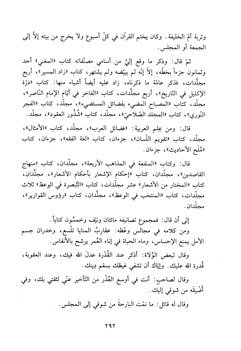 ثُمَّ قال: وذكر ما وقع إليَّ من أسامي مصنّفاته كتاب «المغني» أحد وثمانون جزءا بخطّه، إلّا إنّه لم يبيّضه ولم يشتهر، كتاب «زاد المسير» ، أربع مجلَّدات، فذكر عامَّة ما ذكرناه، زاد عليه أيضا أشياء منها: كتاب «درَّة الإكليل في التّاريخ» ، أربع مجلّدات، كتاب «الفاخر فِي أيّام الْإِمَام النّاصر» ، مجلّد، كتاب «المصباح المضيء بفضائل المستضيء» ، مجلّد، كتاب «الفجر النّوري» ، كتاب «المجلد الصّلاحيّ» ، مجلّد، كتاب «شُذُور العقود» ، مجلّد.