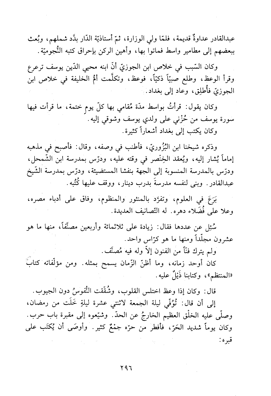 كان أوحد زمانه، وما أظنّ الزّمان يسمح بِمِثْلِهِ. ومن مؤلّفاته كتاب «المنتظم» ، وكتابنا ذَيْلٌ عليه.