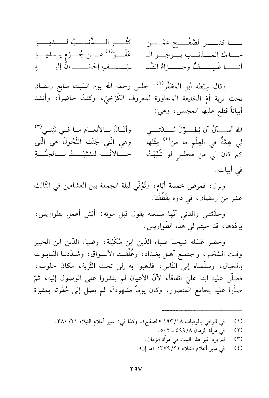 وقال سِبْطه أبو المظفَّر [2] : جلس رحمه اللَّه يوم السّبت سابع رمضان تحت تربة أمّ الخليفة المجاورة لمعروف الكَرْخيّ، وكنتُ حاضرا، وأنشد أبياتا قطع عليها المجلس، وهي: